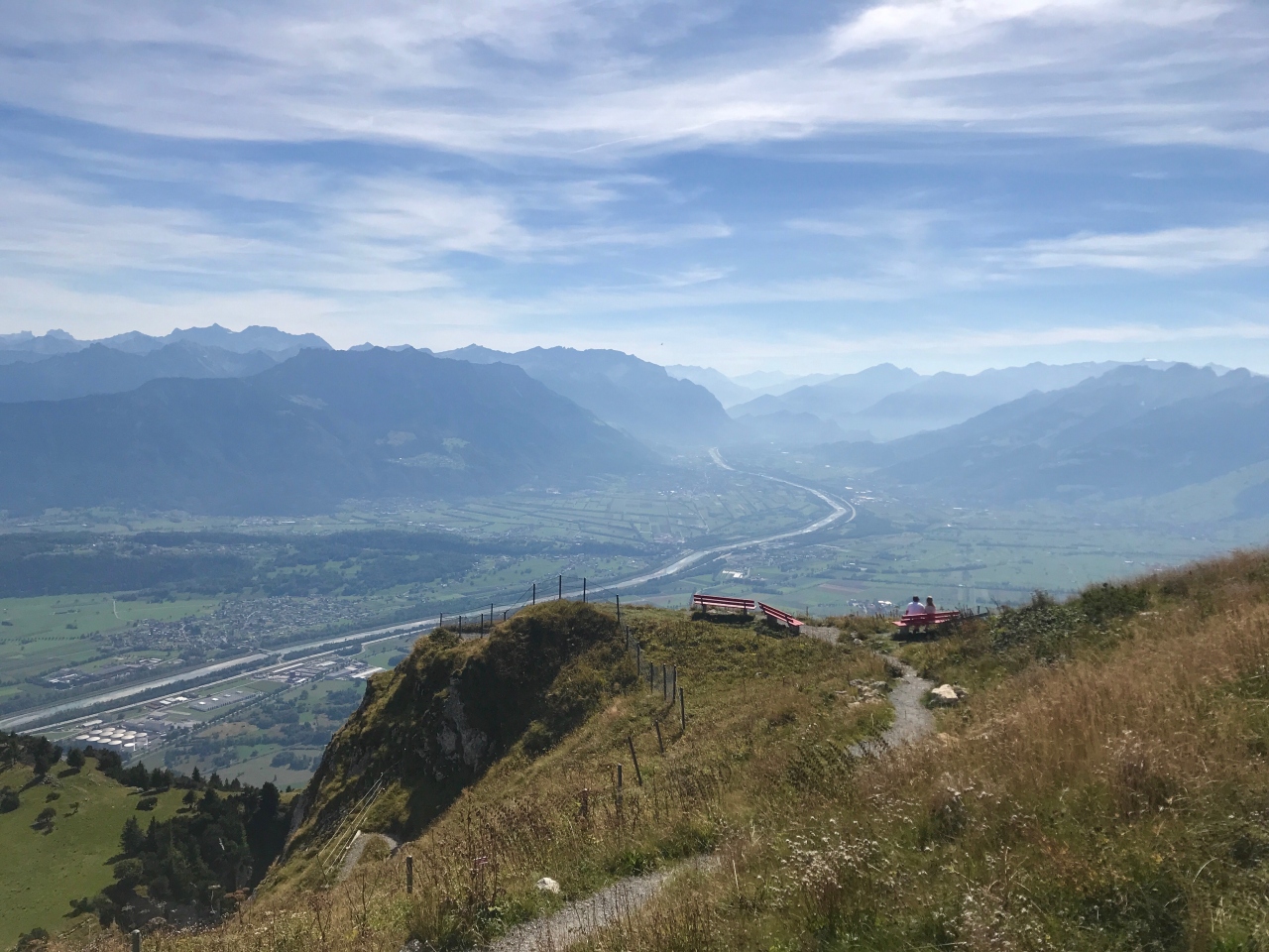 ライン川の向こう側はオーストリアが見え、川の流れる谷間の左側の一部はリヒテンシュタインです
