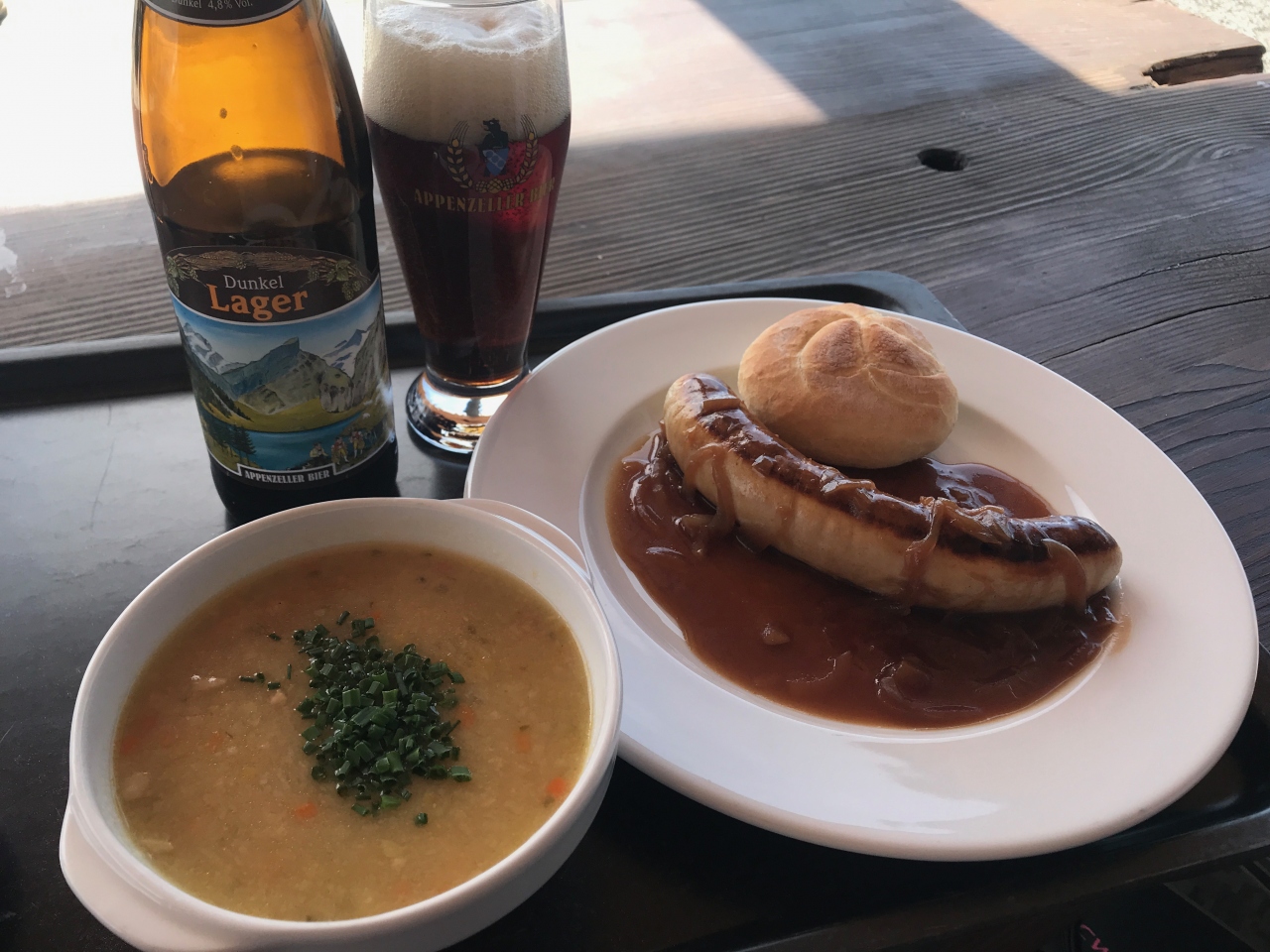 大麦スープとソーセージを食べましたが、お腹もすいていたし美味しかったですが、何より景色を見ながらのビールが最高でした