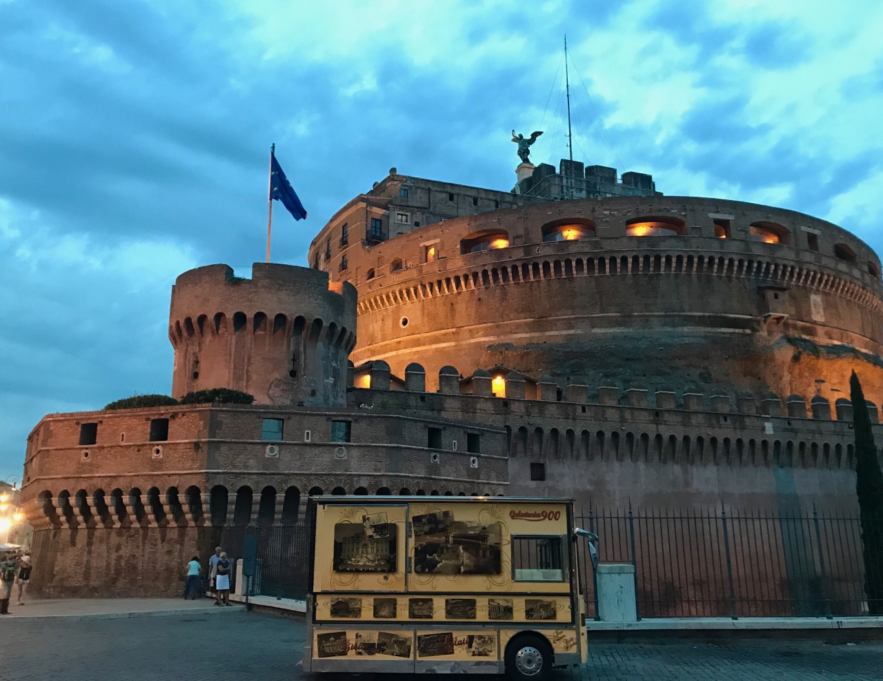 ローマ国立博物館前のバス停から18:30頃出発し、市内をただバスに乗り一周する予定でしたが、コロッセオ、フォロロマーノ、ヴィットリオ・エマヌエーレ2世記念堂を車窓から眺めていると、次のサンタンジェロ城がライトアップされて綺麗だったので、急遽バスを下車しました