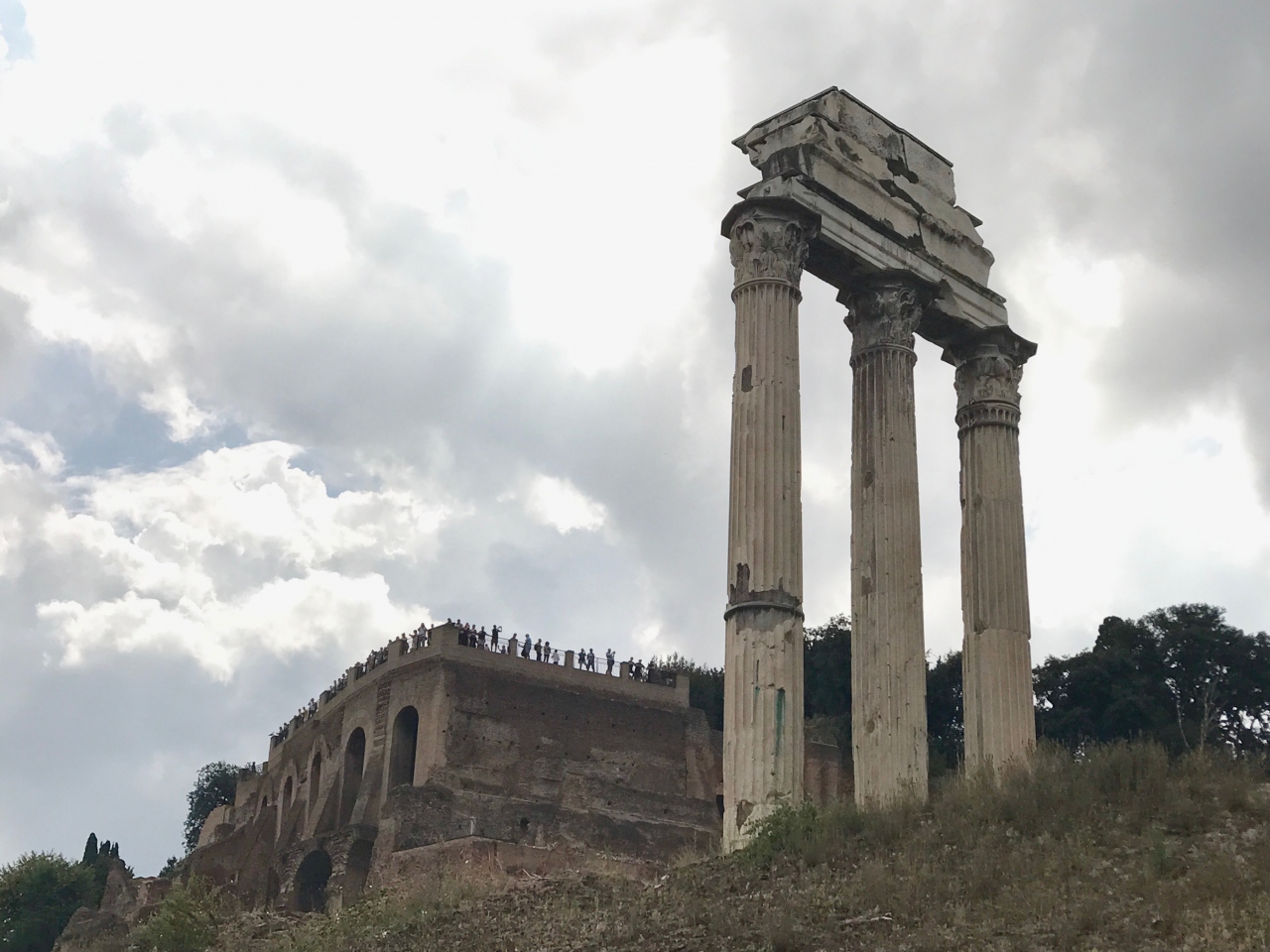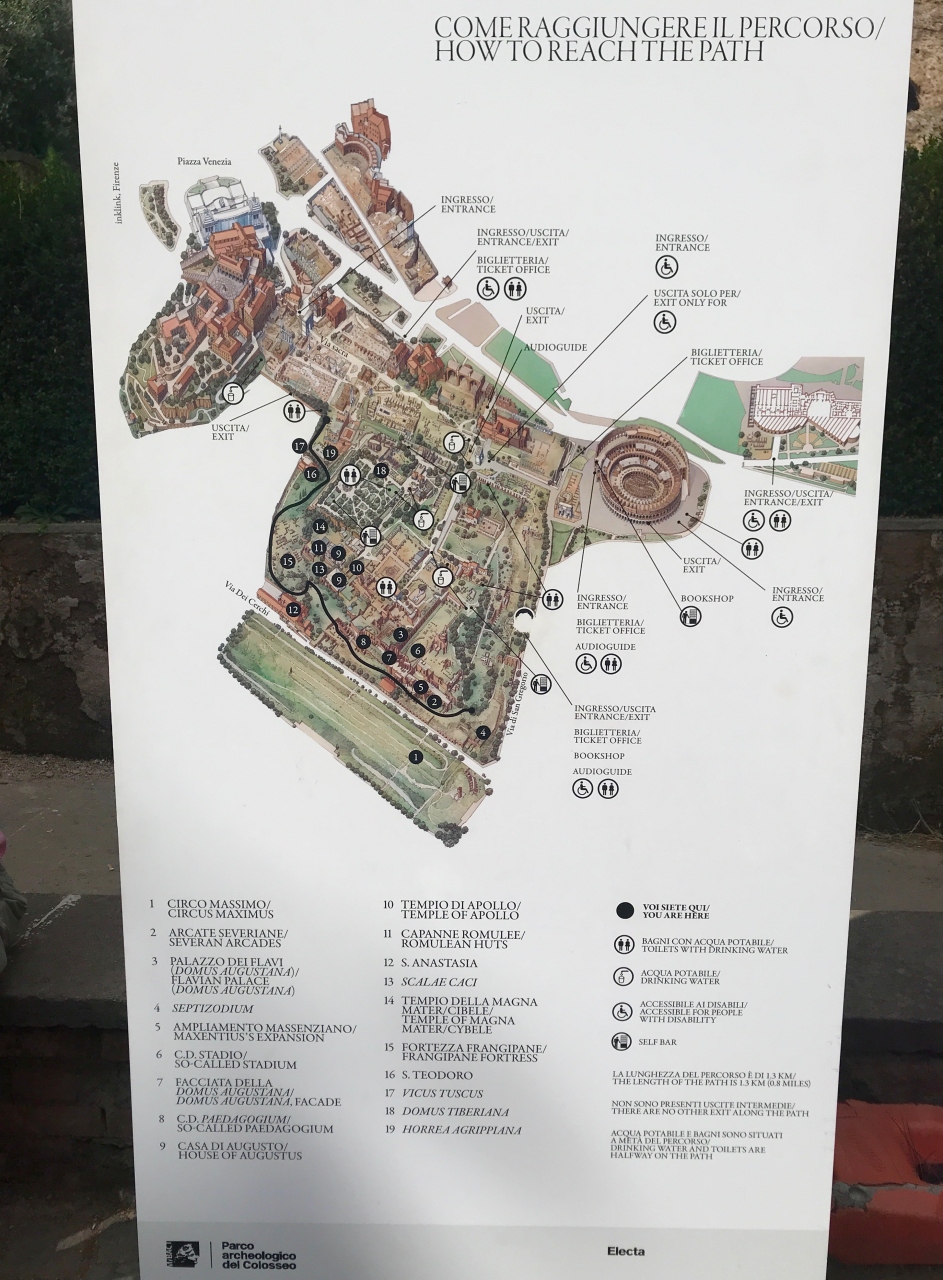 カラカラ浴場から歩いて戻り、コロッセオのホップオン・バス停近くのチケット売り場から入口に入り、最初は左手に上がってパラティーノの丘から歩き始め、フォロロマーノをぐるっと巡り、パラティーノの丘まで一周しました