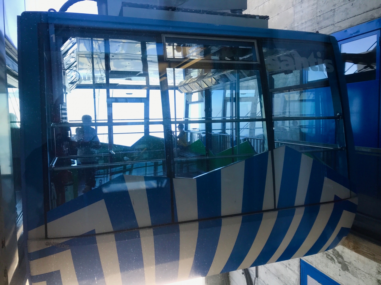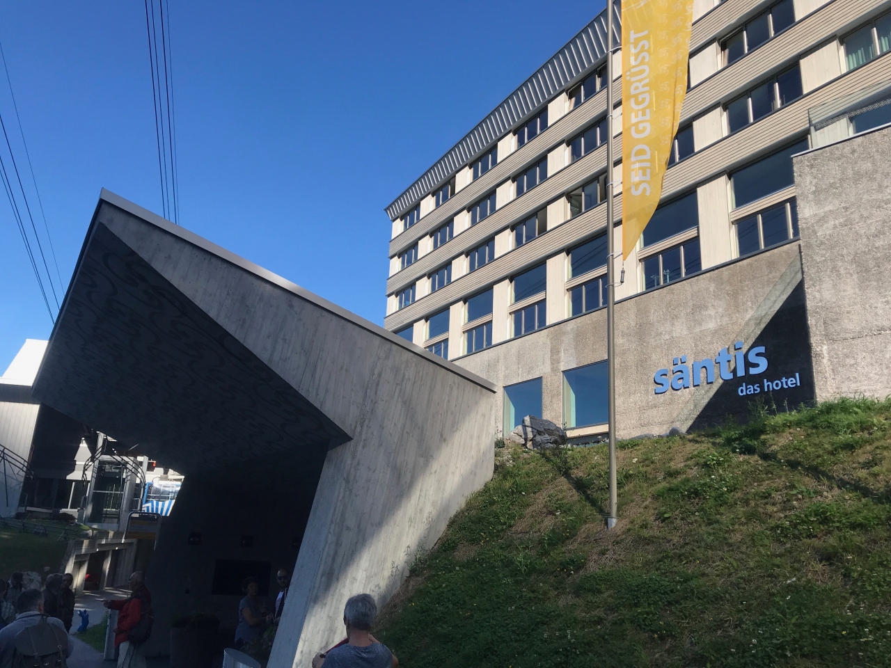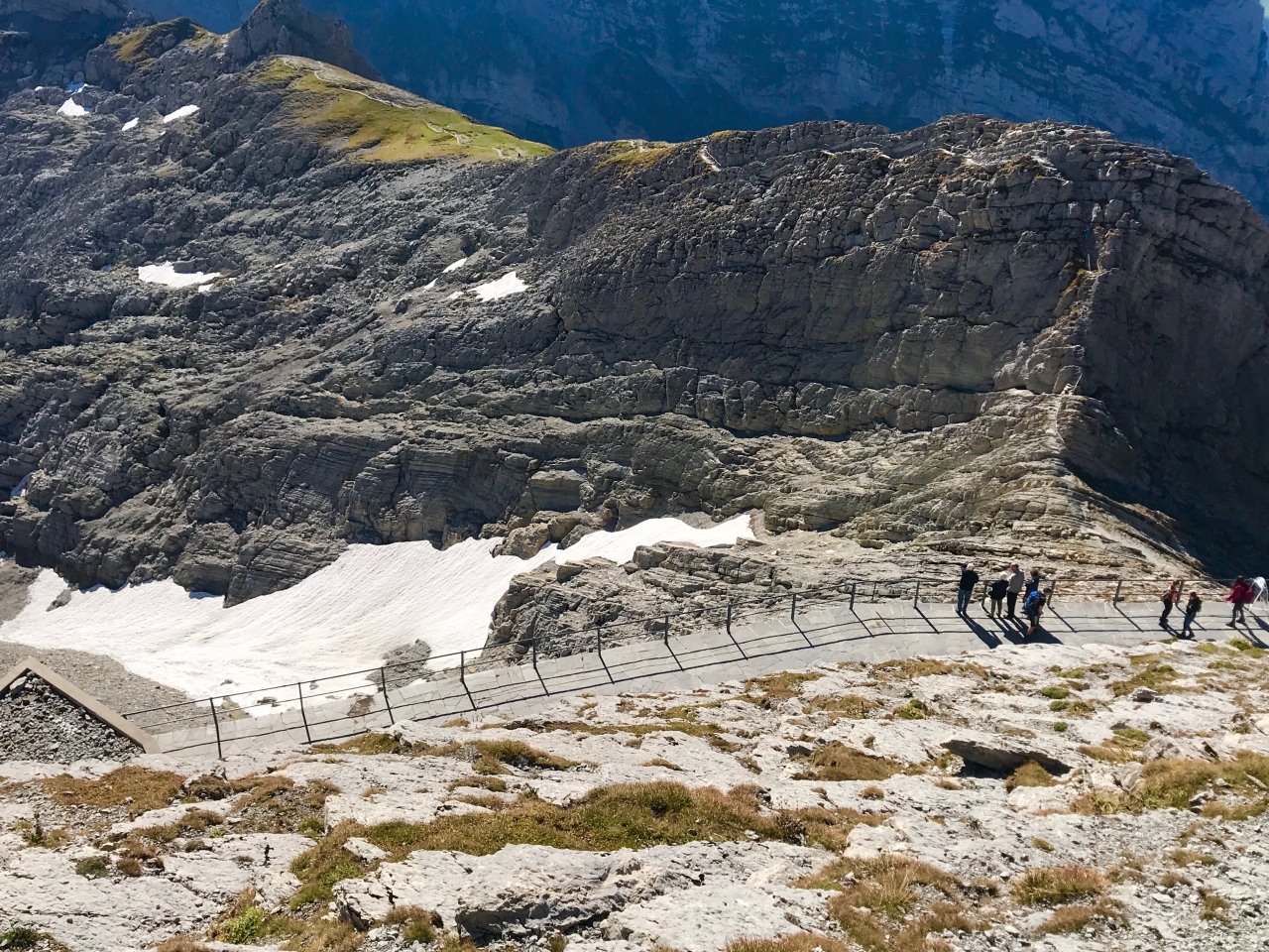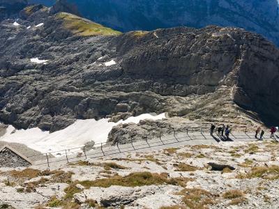 バスを降りるとセンティスへのロープウェイ乗り場は巨大なホテルの中にあり、ハーフ・ウェイ・カードで半額となり往復22.5CHF、約10分でトップに到着すると、外の階段かエレベーターで上に向かいます
