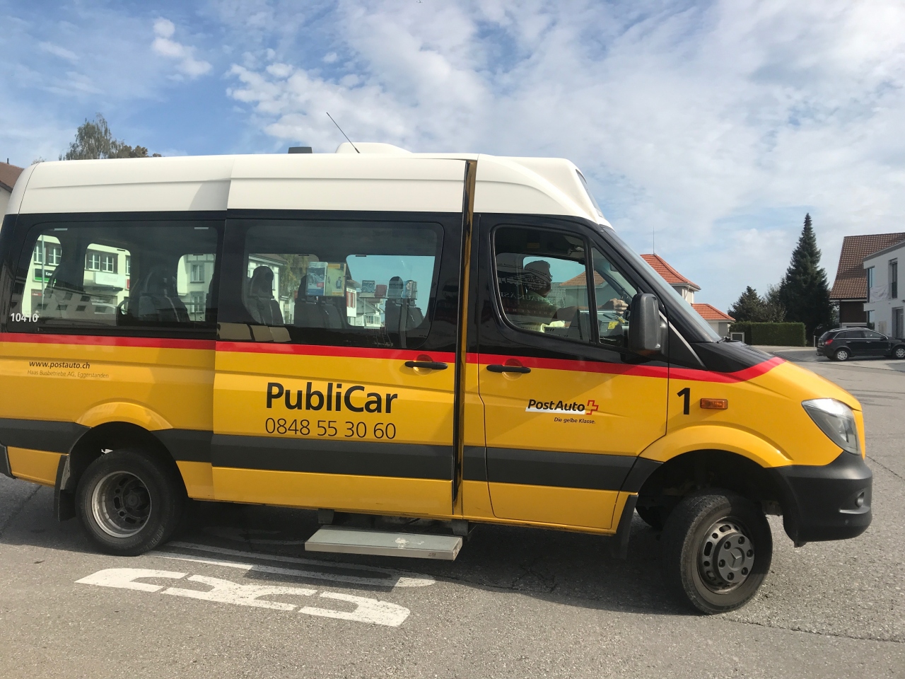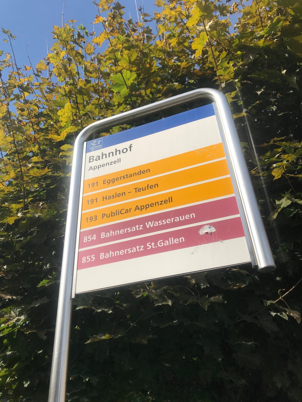 アッペンツェル駅前にバス停があり、パブリックカーも書いてあったので利用してみようかということで、8:35発に乗ろうと思って待っていましたが、なかなか来ないし、スイスの交通機関は時間に正確なはずなので、諦めて電車に乗ろうとしていたところ・・・15分遅れて8:50頃 バブリックカーがやって来ました