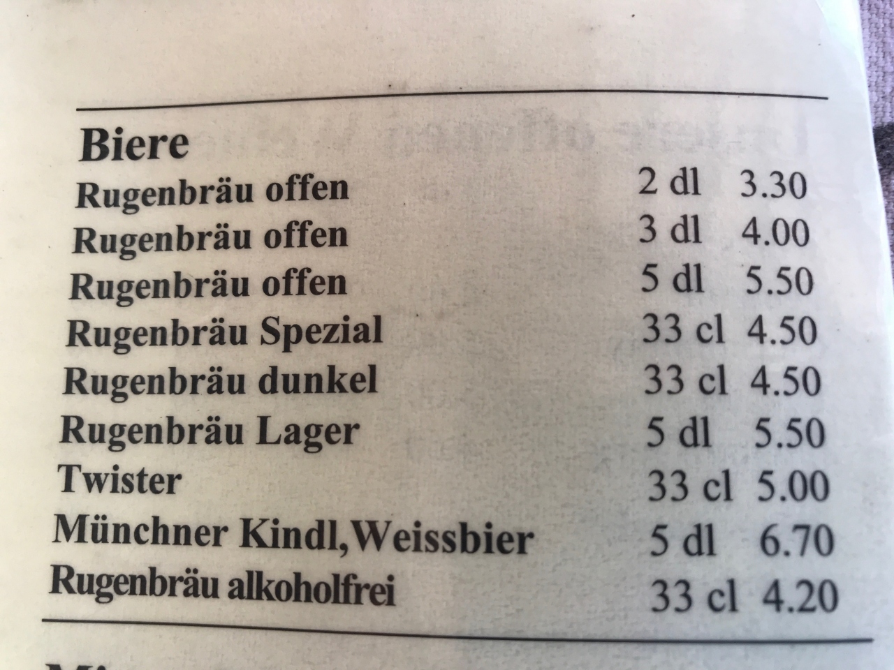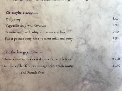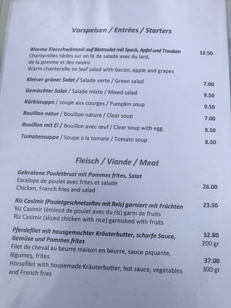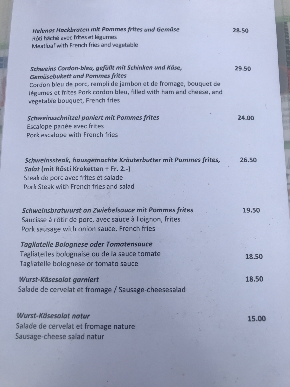 トレッキング後でお腹も空いたのでソーセージとポテト21.5CHF にしましたが、日本なら定食にビール頼んでもお釣りがくる値段です