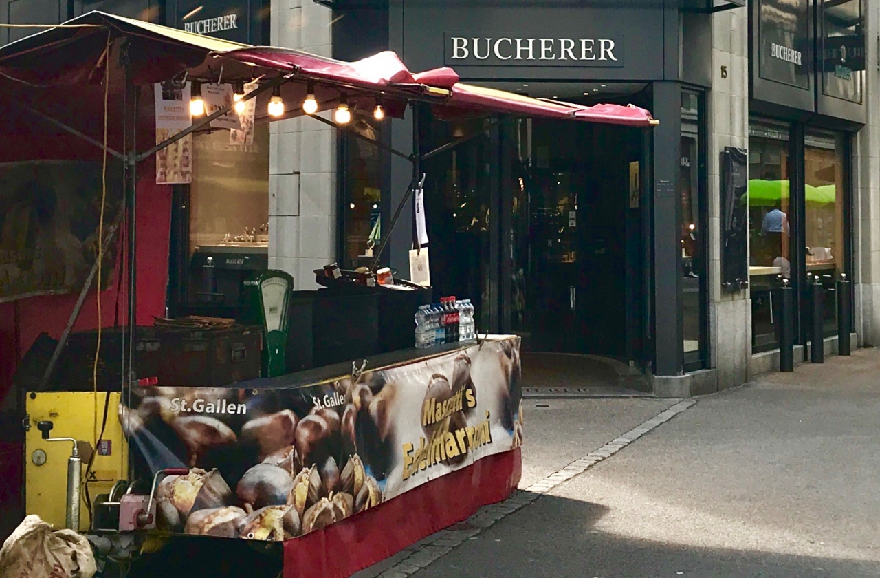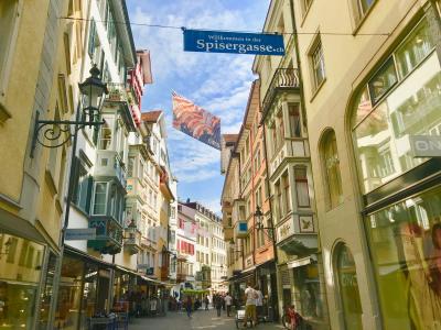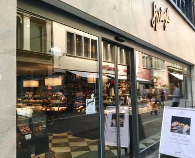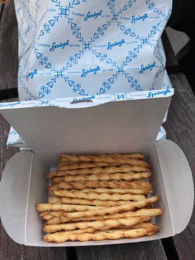 チューリッヒで有名なシュプリングリーの支店もあり、美味しいチョコレートやお菓子を売っていますが、私はチーズ味や丁子のついたステイック菓子が大好きなので、グラムで買いましたが、ここのお店にはカフェは併設されていないため、コーヒーは近くのスタバで買って、通りのベンチに座って頂きました
