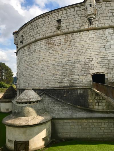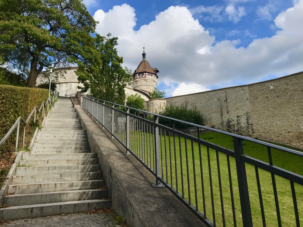 ムノート城塞には色々と登り口があり、バッハ通りから橋を渡って登って行きましたが、なかなか急角度の階段が続きます