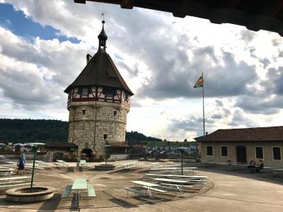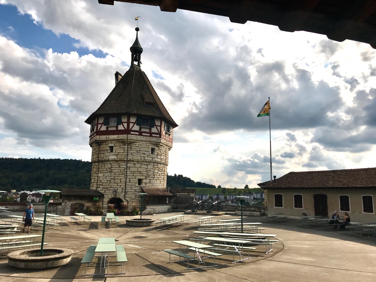 駅から階段を登っていくと、上に見えているラウフェン城に着きますが、城の中を通って滝に行くためには入場料(5CHF)が必要なので、一旦外にあるチケット売り場の方に向かいました