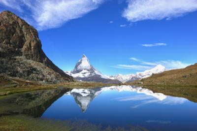 8:57 マッターホルンに雲はかからず湖に波風もほとんどなくパーフェク...