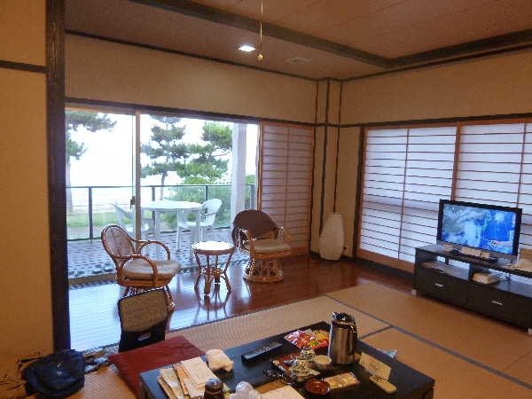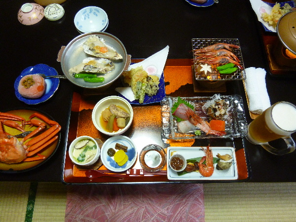 本館だったせいか部屋の見晴らしはいいのだが、縁側の床がたいへん汚くて素足で歩くのに躊躇。やむなくスリッパを使う。食事は珍しく部屋食でゆったり食べたせいか、かなり時間がかかったし、今でも獲れるカニなど美味しかった。