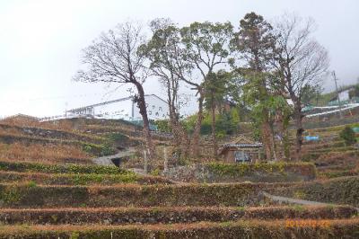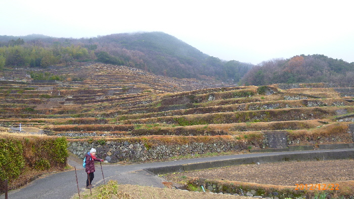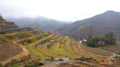 冬枯れの千枚田が続き、雨上がりで山は霧がかかっていただけに、人は誰もおらず夫婦でゆったりした気分で散策ができた。