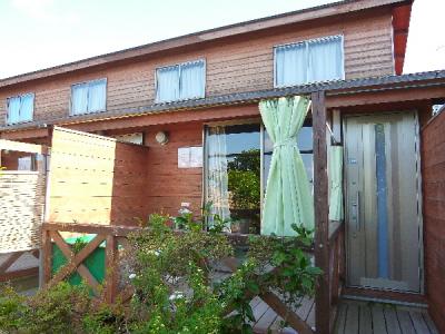 離れのコテージ風のメゾネットの部屋。入口の垣根が強風で倒れている。これにまずびっくり。横に露天風呂がある。カーテンで仕切りがしてあるが、風でまくれあがり何の役にも立たない。おまけに洗面器も風呂椅子も何もない。ソープやシャンプーすら!