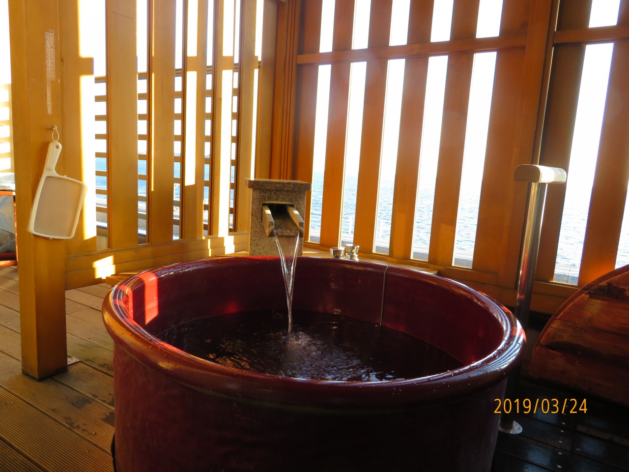 2年前に続いての宿泊。フロントで「リピートのお礼です」といきなり粗品(温泉の素)をいただく。この配慮はうれしい。部屋もきれいになったし、食事も抜群によくなった。何より大浴場がリニューアルされて、広さも眺めも申し分なし。単純アルカリ泉30度とのことながら、なんとなく温泉も濃くなったような感じ。肌にしっとりまとわりつくようだ。温泉水風呂というのがあったが、温度は30度くらいか。これならいつまでも入っていられる。