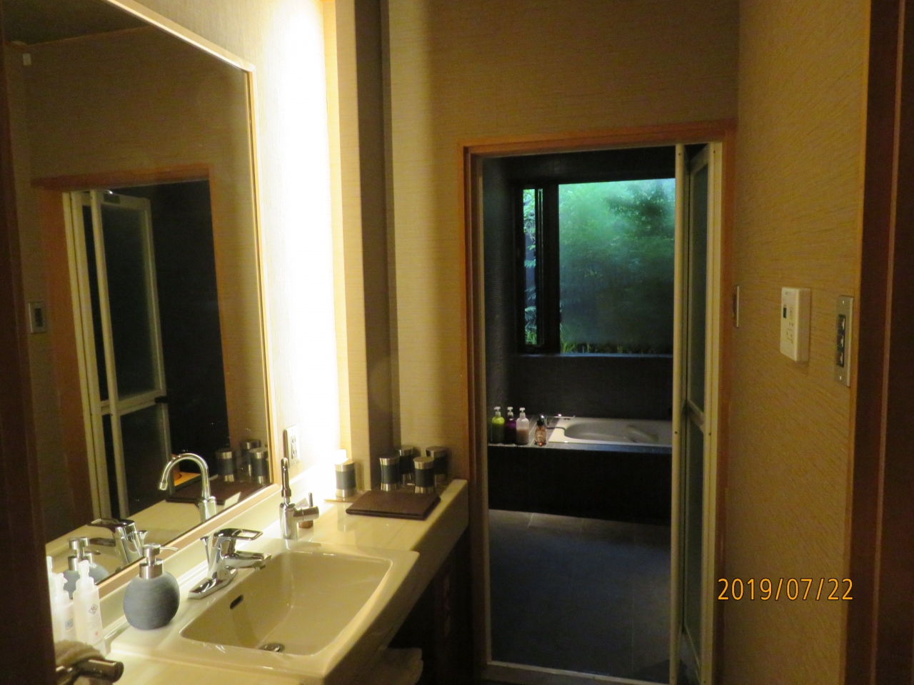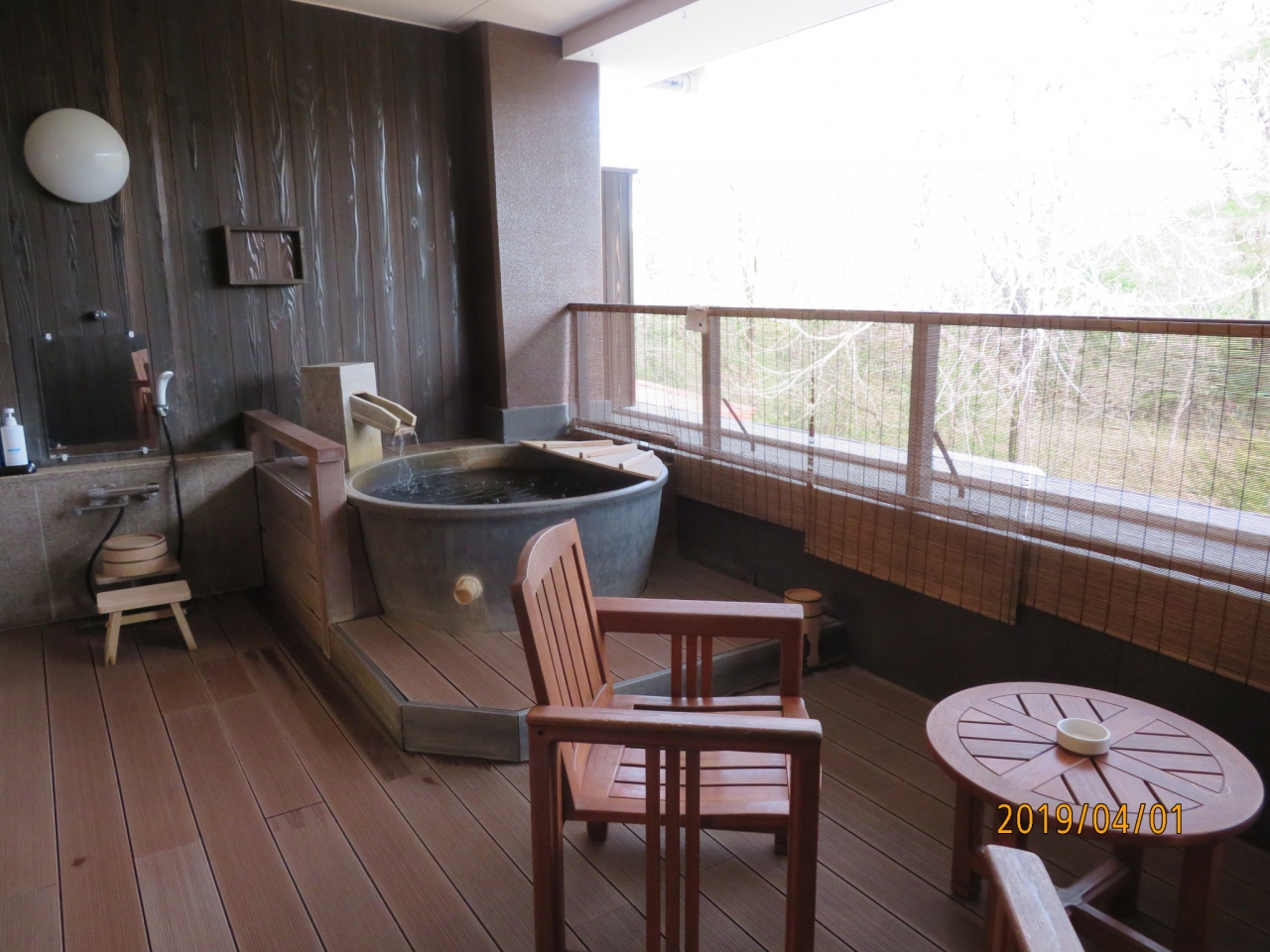 部屋露天は温泉かつ循環式で、いつでも入浴できる。単純弱放射能泉、29.4度。加熱。お湯はやわらかい。食事は自家農園の野菜がふんだんに供される。ハーフビュッフェのステーキは食べ放題。目の前の炭火焼だからやわらかい。