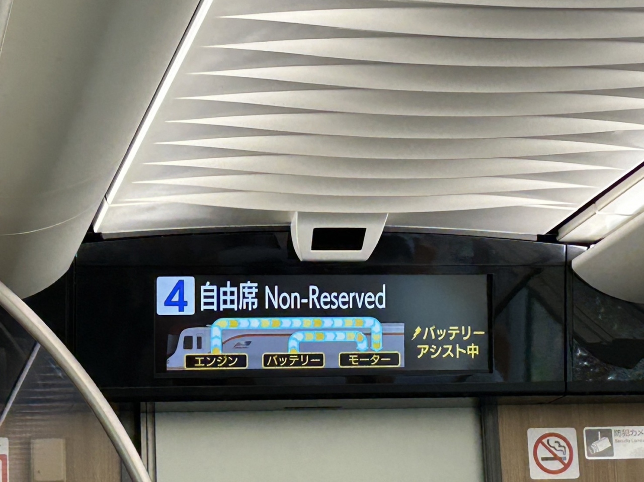 新造車両なのでピカピカでテンションが上がりますが、車内にもいくつかポイントが! 各車両の通路からデッキへ向かう扉上にあるフルカラー液晶ディスプレイには、走行装置の使用状況を図示する機能もついています。またデッキには沿線地域の伝統工芸品を鑑賞できる「ナノミュージアム」も設けられています。高山止まりの4号車と富山まで行く9号車との間には運転台もあるので萌えポイントでもあります。車内チャイム「アルプスの牧場」の演奏はスギテツのお二人が担当。往年のディーゼル車内で流れていた名曲が現代風にアレンジされて復活しています。