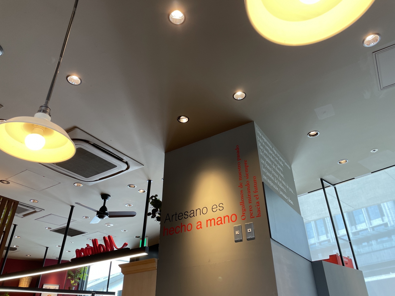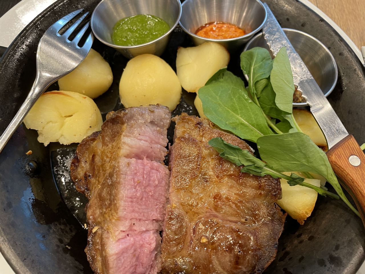 ランチメニューから、私は「イベリコ豚ロースのステーキ」(2,200円)をチョイス。パエリアパンで提供されるポークステーキなのですが、ジューシーな肉質と上品な脂身の甘味が絶品で、250gでもペロリとイケちゃいます。もちろんマ◯リーさんとはお値段が違いますが、さすがの味わいにうなります。3種類のソース(緑はカレーっぽい・オレンジは酸味があってドレッシング的・もう一つは粒マスタード)が添えられていますが、私はそのまま味わうのが一番好きでした。 2種のパンが付いているのですが、食パンも耳まで美味しく、前述のソースも活躍してくれました。