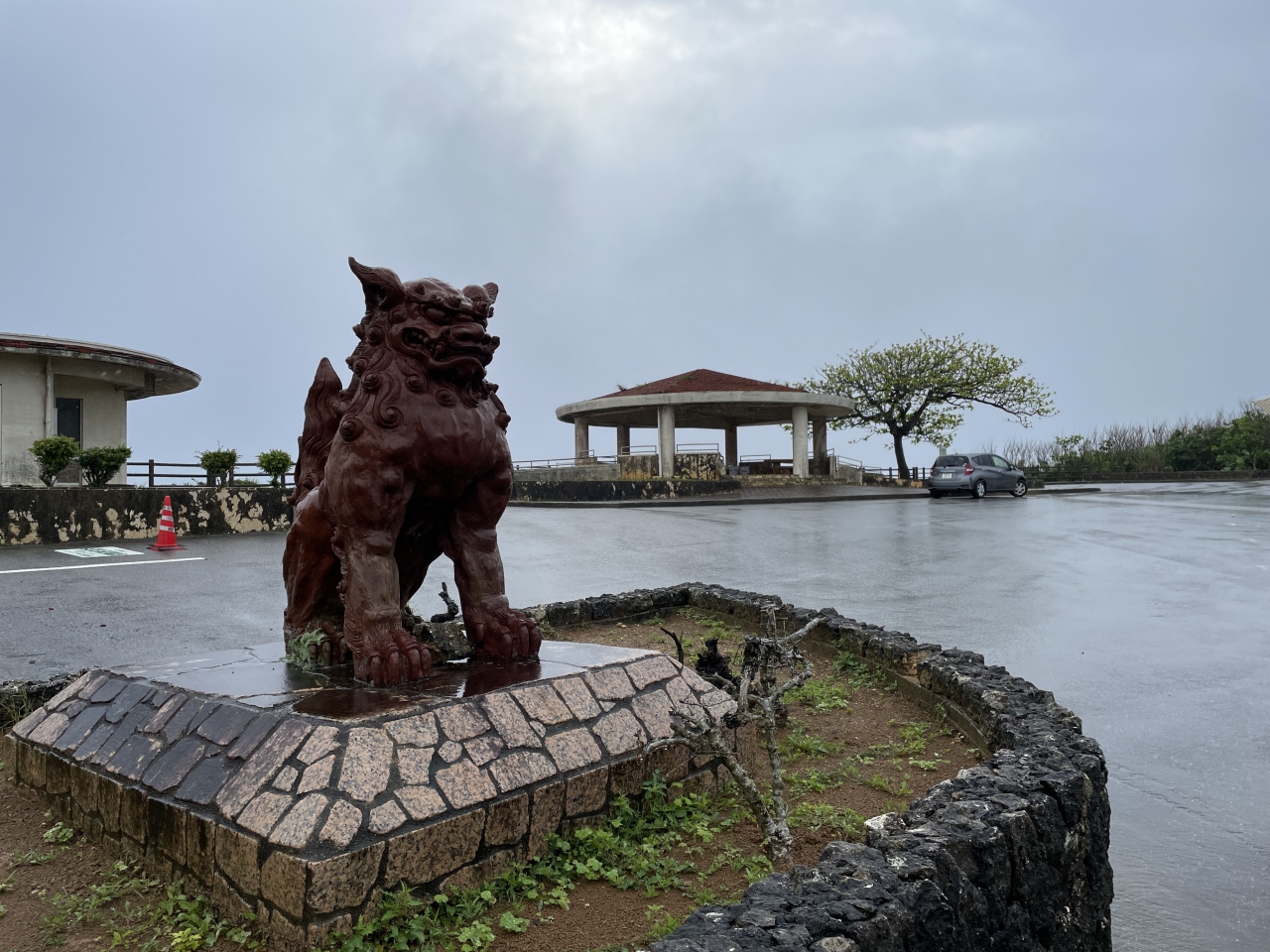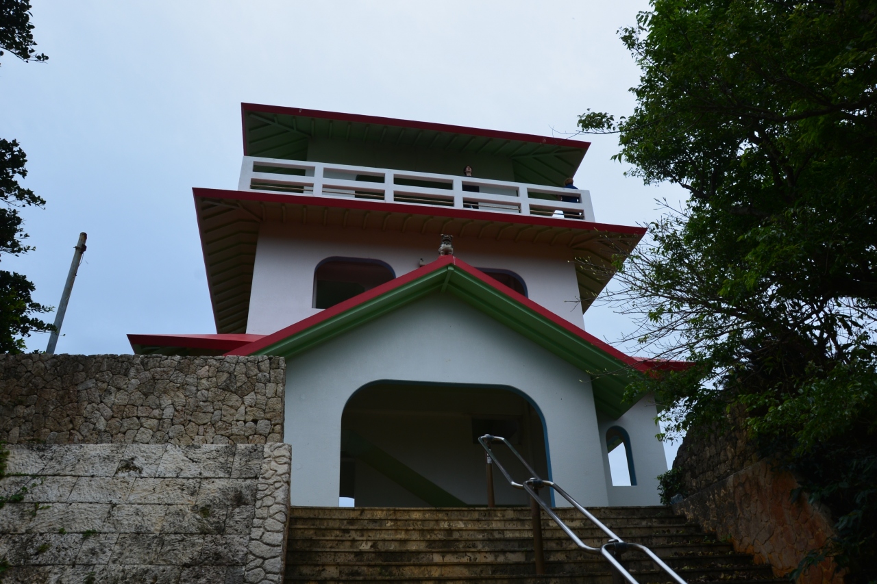 広い駐車場には観光バスも止まっていましたが、お客さんの多くは無理に下車しないような荒天でしたので、駐車場から灯台まで傘も利かない雨に逆らって歩くと、服はびしょ濡れ・・・。そんな私たちを出迎えてくれた灯台職員の方は「こんな天気の中、よく来てくださいました。よかったら三線の演奏でもいかがですか」と予想外の提案をしてくださったので、二つ返事でお願いしました。私たちだけのためのライブ会場と化した灯台では、朝ドラ「ちむどんどん」で聞き覚えのある2曲を聴かせていただけました。思いの外大きく響き渡る音色と歌声に聴き入りました。