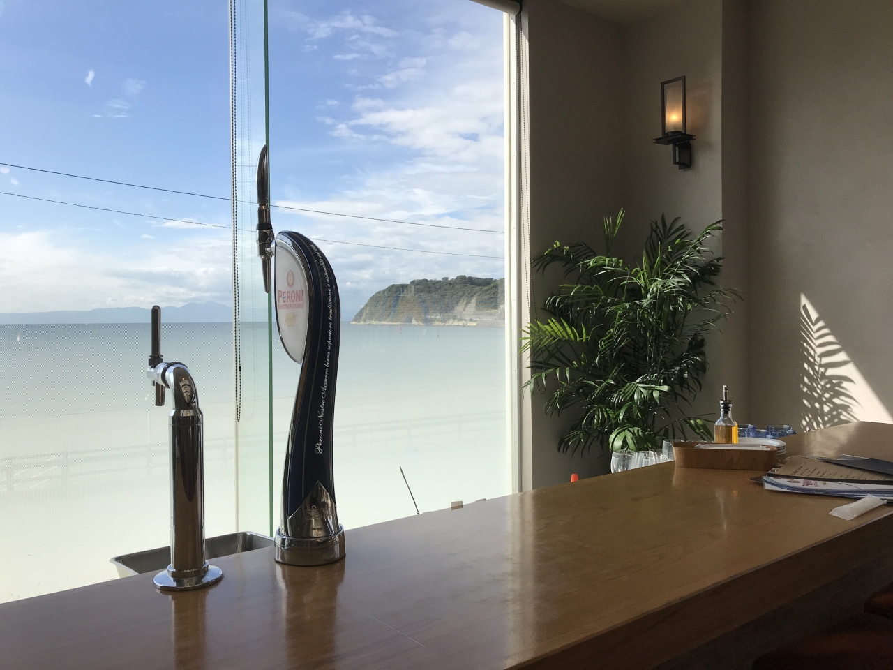 私たちは海に向かって突き出した棟の方へ案内されましたが、その先端は大きな窓の前にカウンター席がありました。きっと此処がベストポジションなのだと思います。