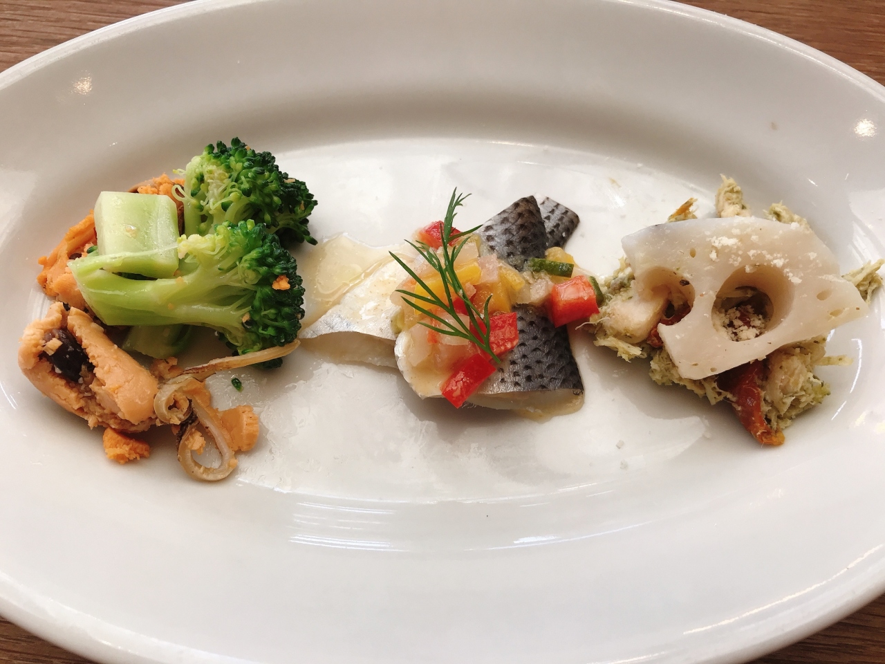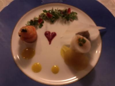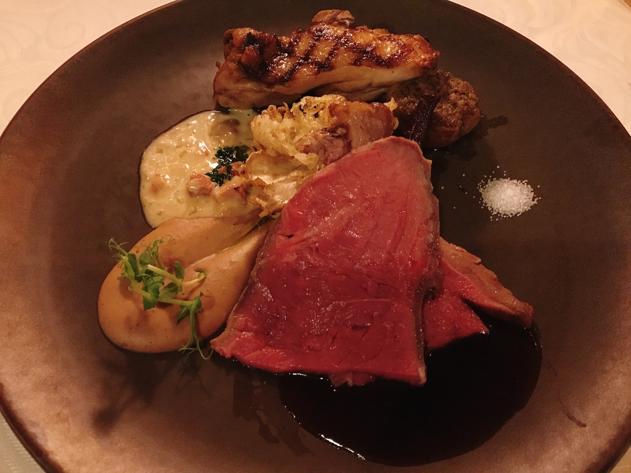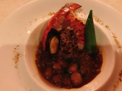 オードヴル・ヴァリエは2種類から選べましたが、家内は「スモークサーモントラウト、帆立貝とイクラ、ビーフのムース」、私は「オマール海老のシーフードガンボ」をチョイス。ガンボはケイジャンの味付けということでしたがさほど辛くはなく、キヌアを活かした味わいでした。オマール海老も食べ応えがありました。