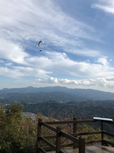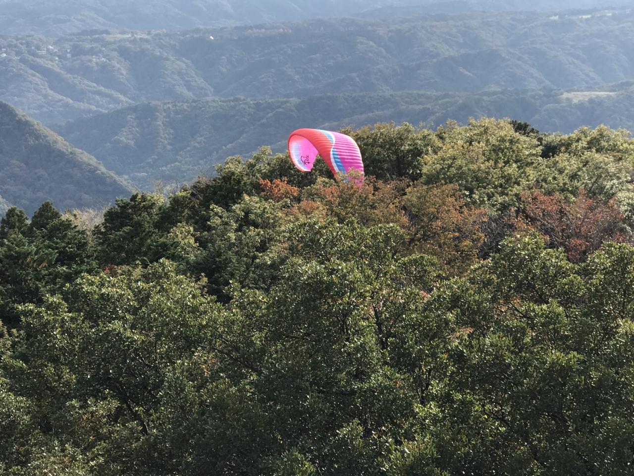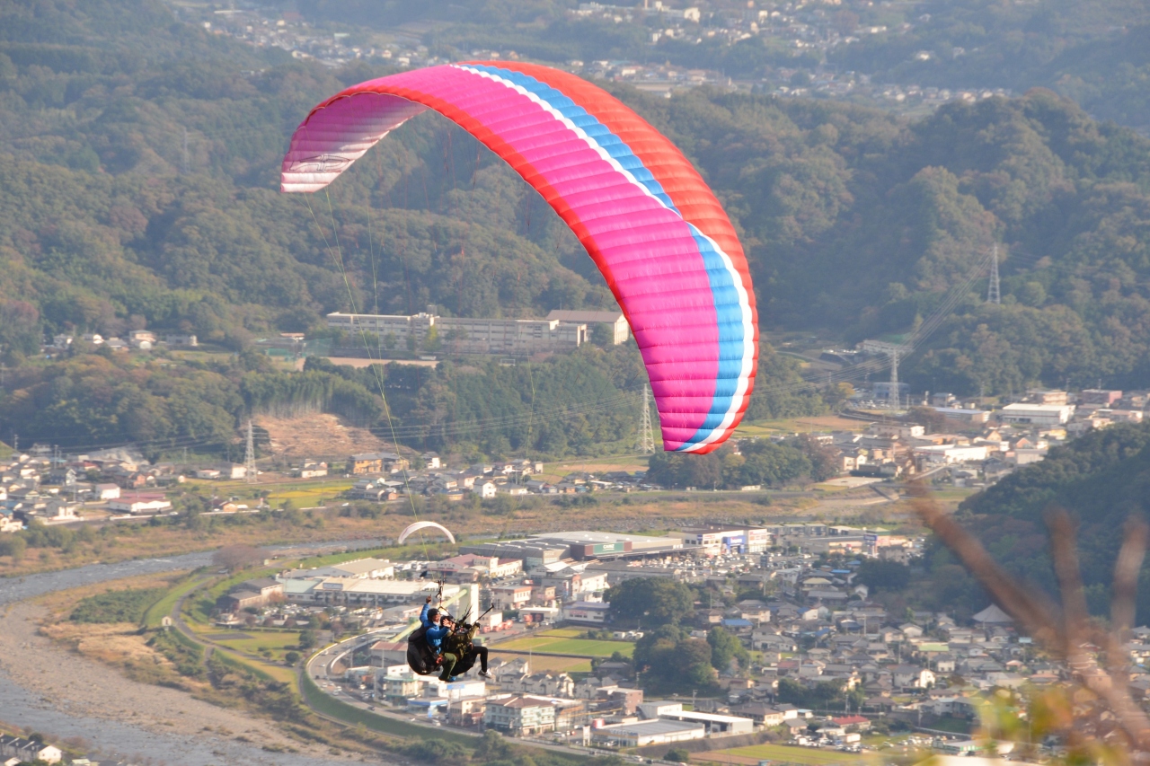 さえずりの丘から眼下の狩野川の右方向を眺めていたら、突然人の声が! なんとパラセーリングを楽しむ人が隣の山から飛び立ったのです。気持ちよさそうに、文字通り空を舞っていました。