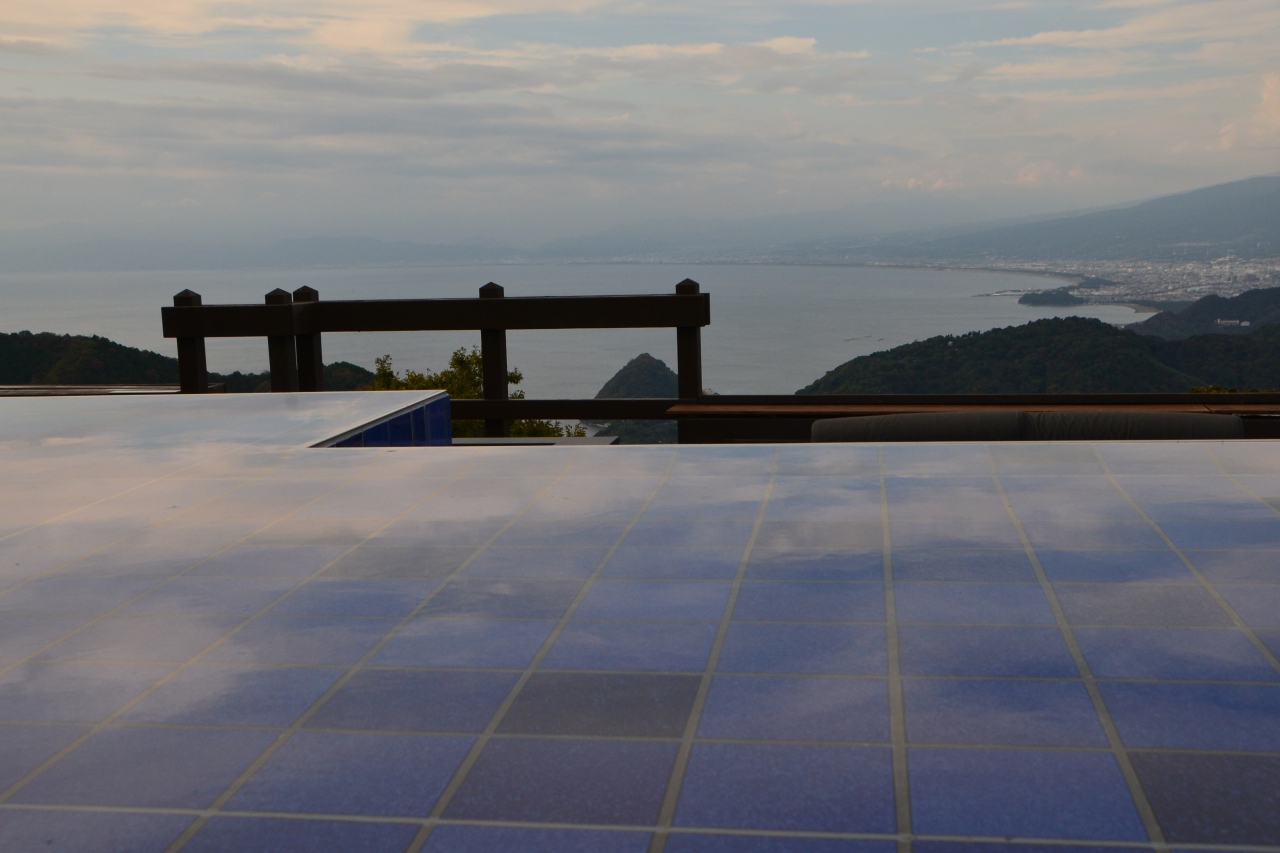 山頂駅近くのかつらぎ茶寮では軽食もいただけますが、富士山を眺めながらのソフトクリームは格別でした。水盤の向こうには淡島も見下ろせました。- 旅行時期