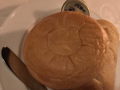 メインディッシュは「ローストビーフと銘柄鶏のグリエ、ポルト風味の赤ワインソースとバーボンクリームソース」でした。ローストビーフは上手く仕上がっていて、赤ワインソースとマッチしていました。鶏肉のグリエは普通・・・。鶏の代わりに魚料理が欲しかったところですが、添えられていたバーボンクリームソースが今までに経験したことのない風味と味わいでかなり気に入りました。パンにも付けていただきました。そうそう、パンにはミッキーの焼印が捺されているのです。家内はミッキーの形にくり抜いて、外側から食べていました。