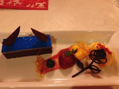 デザートは「チョコレートケーキとアプリコットパルフェ、フルーツ添え」。野獣の衣装のイメージである青が鮮烈な、若干食欲の減退する色合いのケーキでしたが味は美味しかったです。