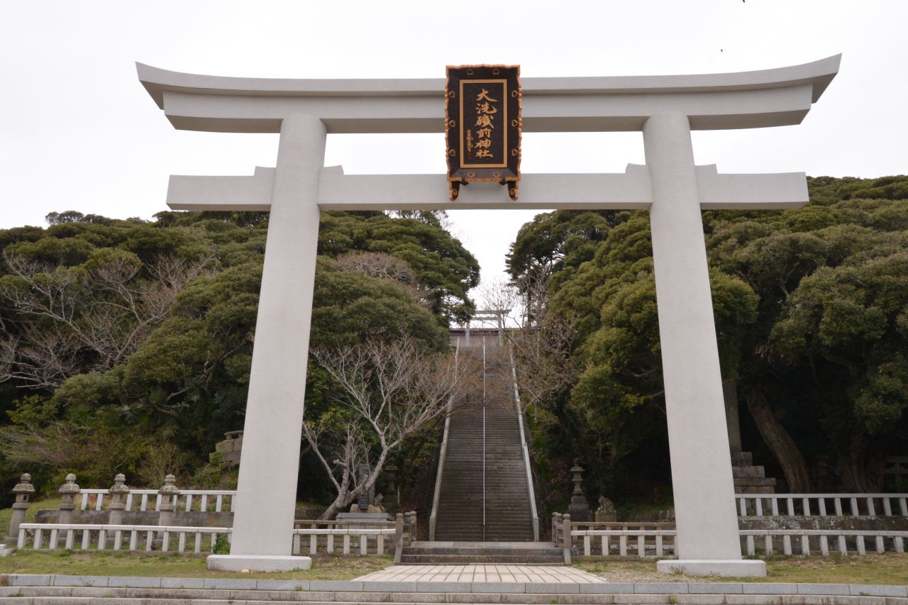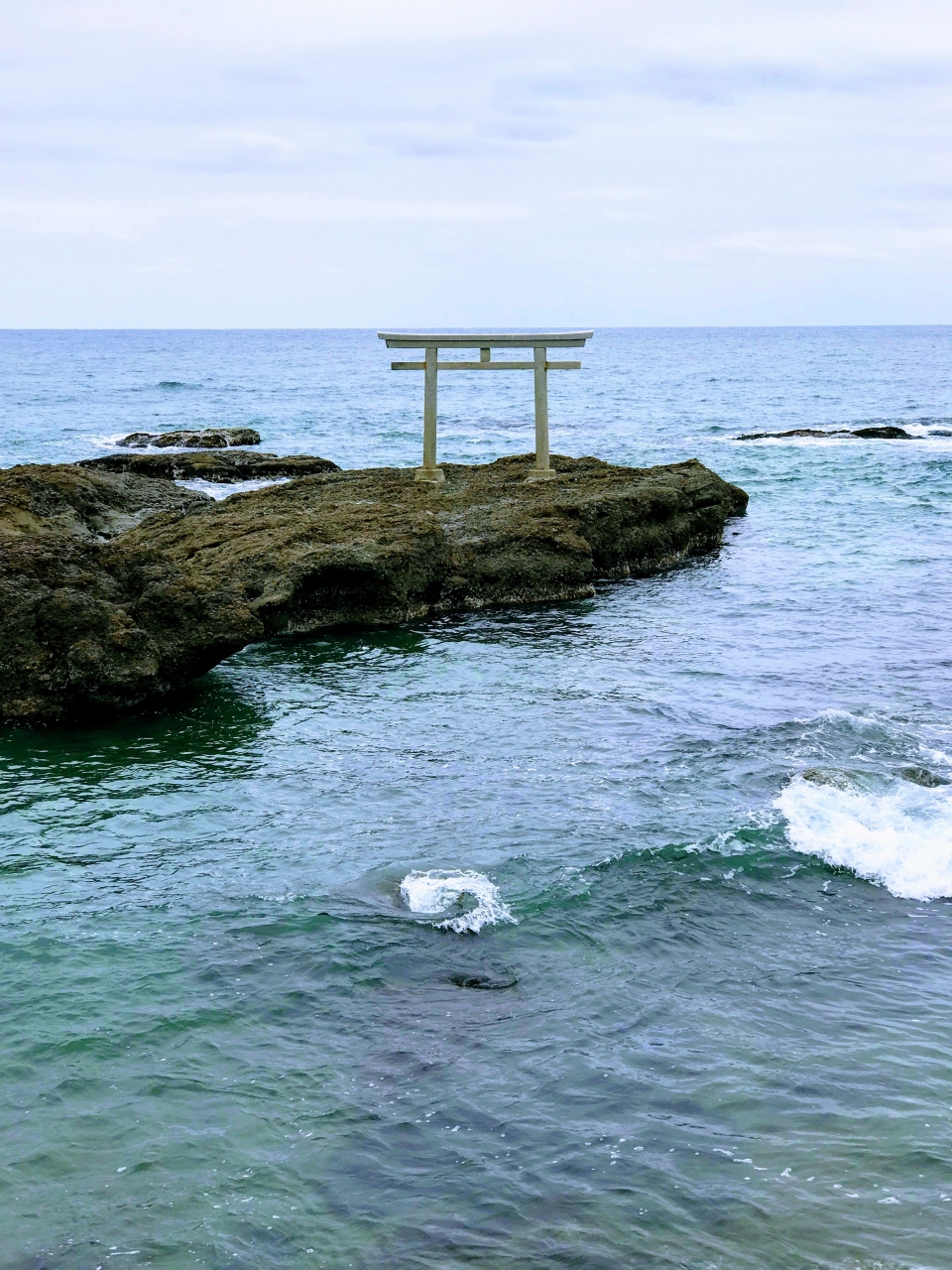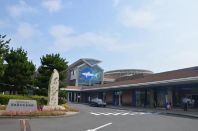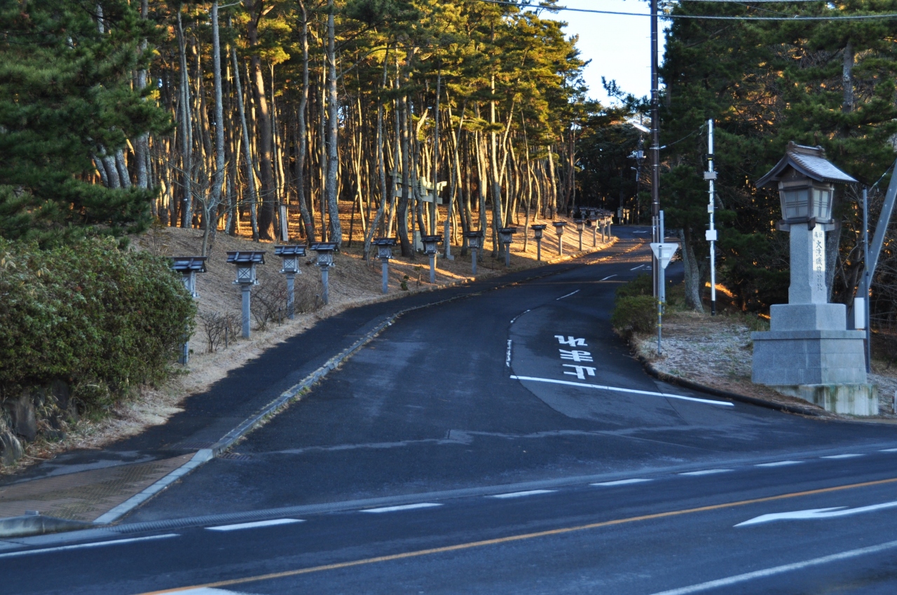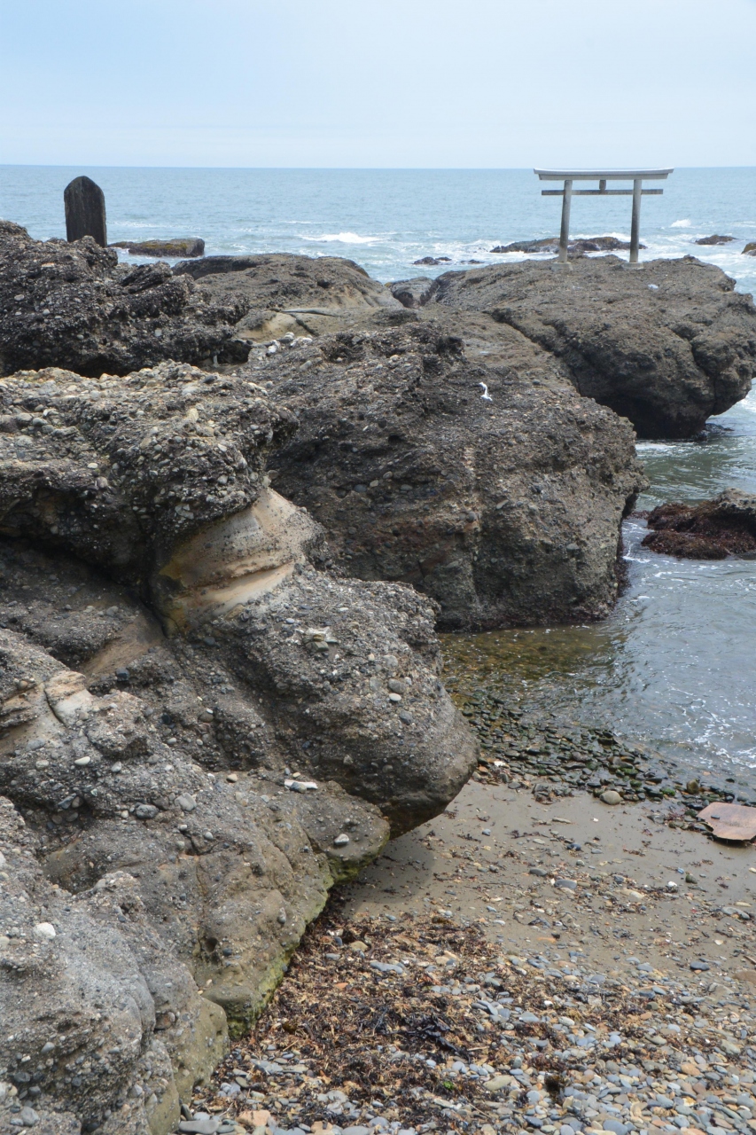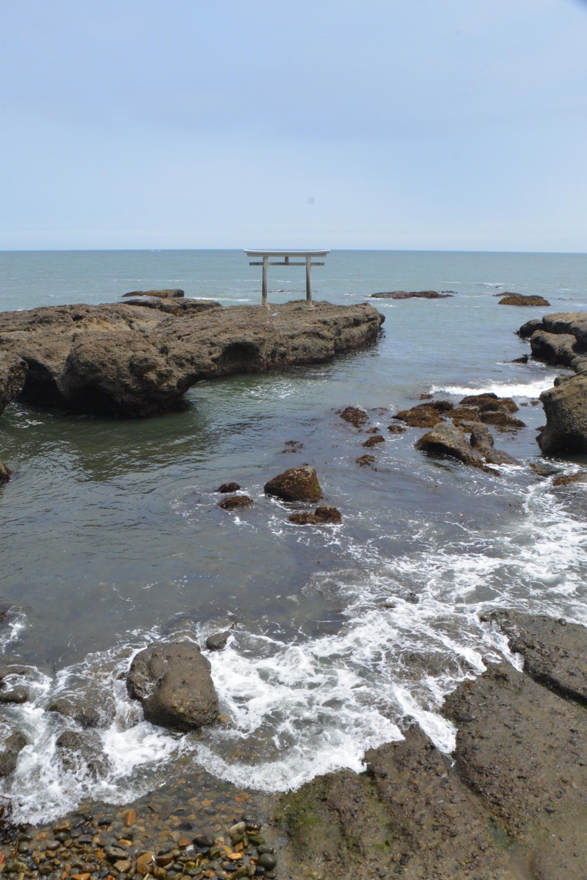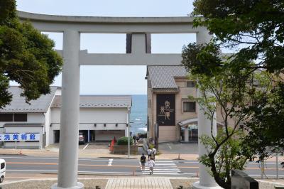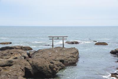 駐車場は、巨大な一の鳥居脇の大洗ホテル前から上った高台にあります。拝殿の左には当然ながら前回とは異なる大きな絵馬が飾られていました。それと向かい合うようにガルパンの絵馬も(笑) 御朱印を拝殿に向かって右の社務所でいただいた後、正面の石段を下り、二の鳥居をくぐって海側へ。そこには御来光時にはカメラを手にした多くの観光客が集う場所が。海上の岩の上に立つ有名な「神磯の鳥居」の正面に出られるのです。再び二の鳥居へ戻り、近くのいそやにあるガルパン休憩所が気になりました。