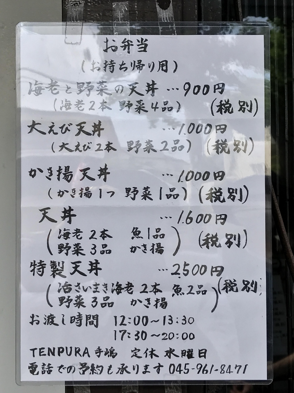 プライベートで上司と遇ったこともあるお気に入りの天麩羅店も、いよいよテイクアウトを始めたと聞き、予約。昼の開店時にはなかなかつながらず、ようやく昼の閉店間際に電話がつながりました。