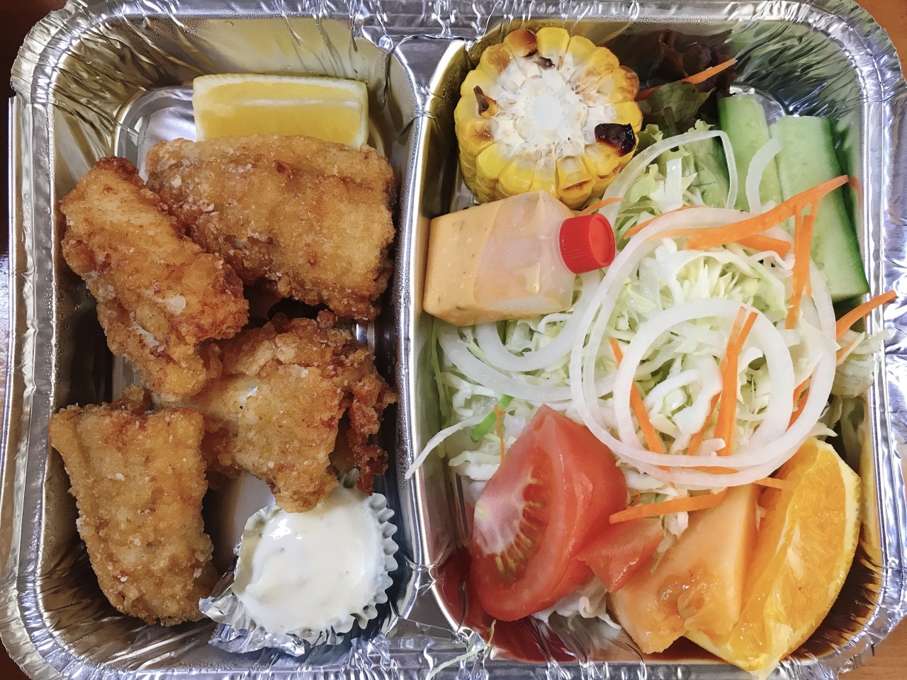 昼に予約した時に、ご飯は要らないんですねと念を押されたのですが、確かにお弁当として詰め合わせることが出来るアルミ容器に入っていました。おまけに揚げたての熱々です! 予想以上の肉厚で、付いているタルタルも良し、塩であっさり頂いても良しでした。高齢の母も大満足でした。