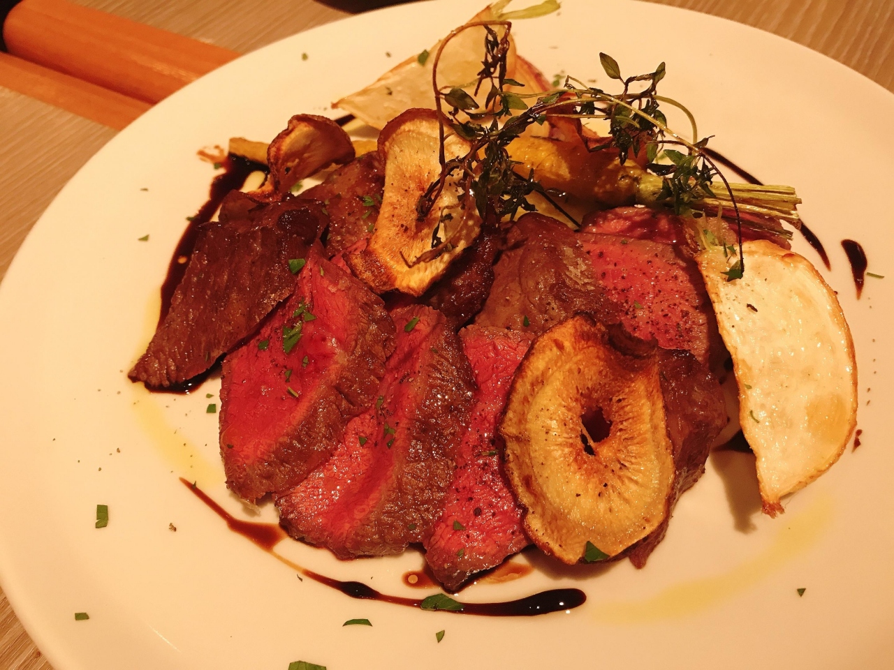 続いては静岡県産の牛ランプ肉のロティをいただきました。うーん! 肉本来の味わいを感じさせてくれる、期待を裏切らない一品でした。塩加減もちょうど良かったのですが、エチュベに付いてきたバーニャカウダソースを付けてもイケましたよ。