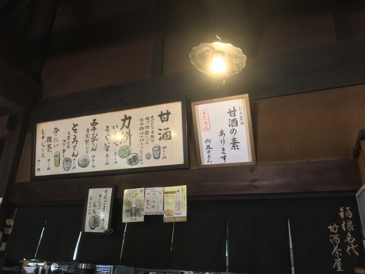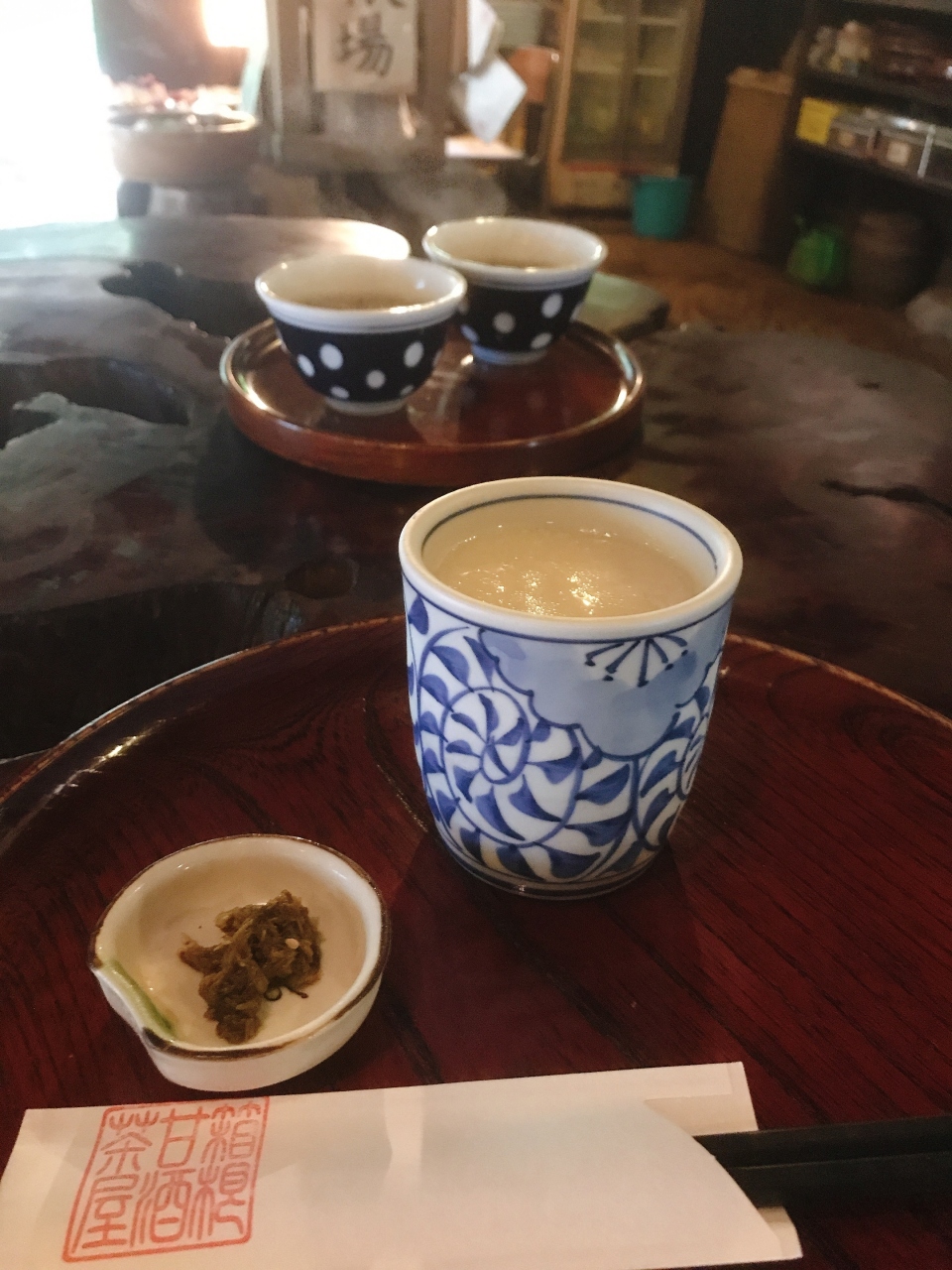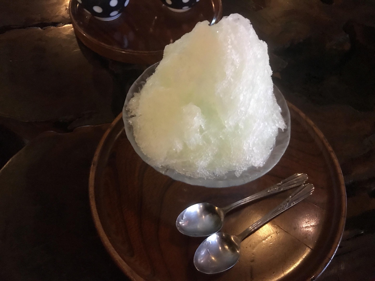 甘酒は温かいのはもちろん夏場だからか冷たいものも用意されていたので冷の方を注文。添えられたちょっぴり塩っぱい漬物もうれしい味でした。かき氷も様々ありましたが青うめは大正解! 削られた純白の氷がかすかに碧味を帯びて登場。疲れも消え去る美味しさでした。