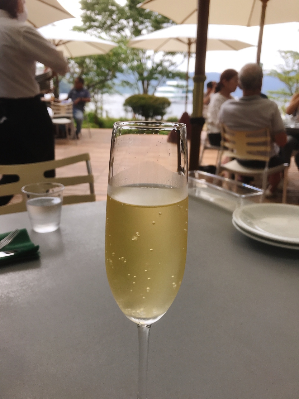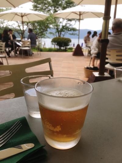 それでもテラス席の湖に近い方のエリア最後の1テーブル(わんこも一緒に楽しめる湖から遠い方のエリアを含めると50席ありました)に滑り込み、ノンアルコールビールで喉を潤します。ノンアルもビール風飲料が2種とスパークリングワイン風飲料が選べるのはありがたいところです。
