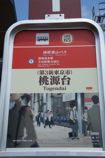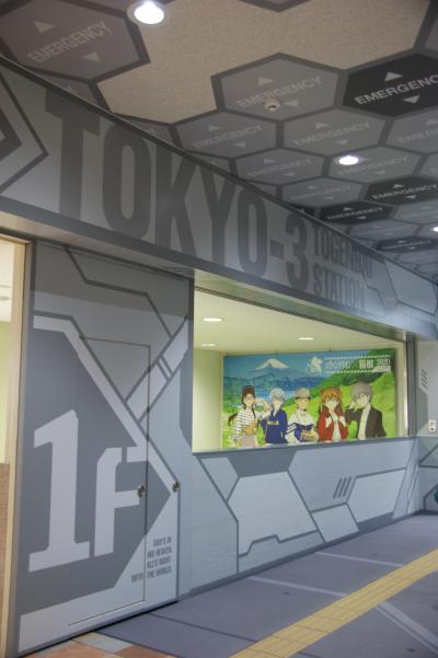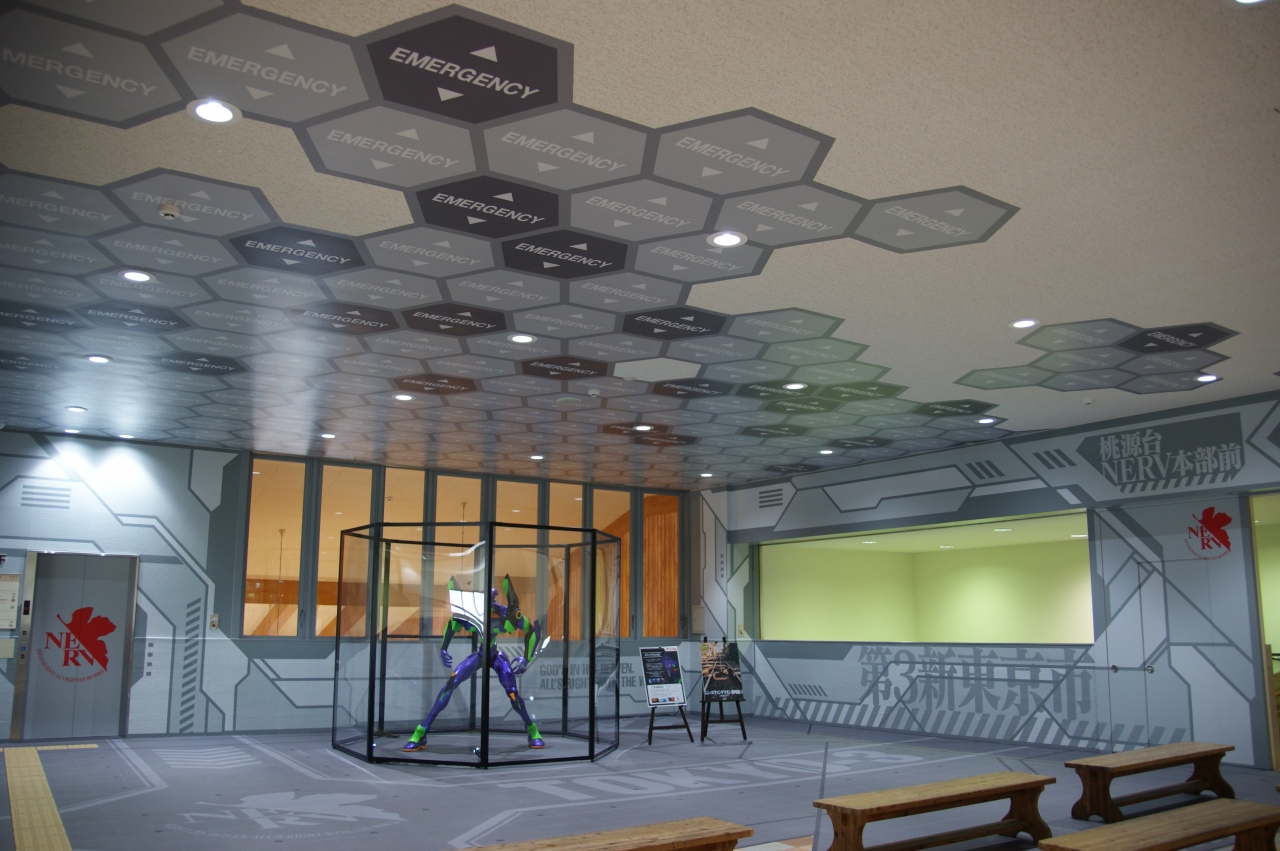 桃源台駅は、箱根ロープウェイ(ゴンドラ)や海賊船(遊覧船)に乗る人は専用の駐車場がありますが、その予定がない方は少し離れた公衆トイレ前の駐車スペースを利用してください。エヴァンゲリオンでも桃源台中央駅として登場するこの建物の1階は、2020年はコラボ企画としてNERV本部をイメージする大規模ラッピングにより飾られており、エヴァ初号機のフィギュアも展示されています。若い人よりもおじさん(まれにおばさん)世代がやや興奮気味にやって来るのが印象的でした。