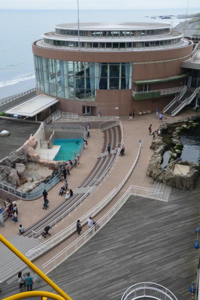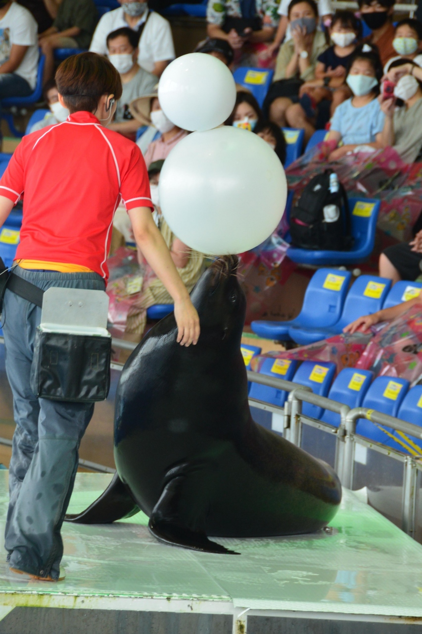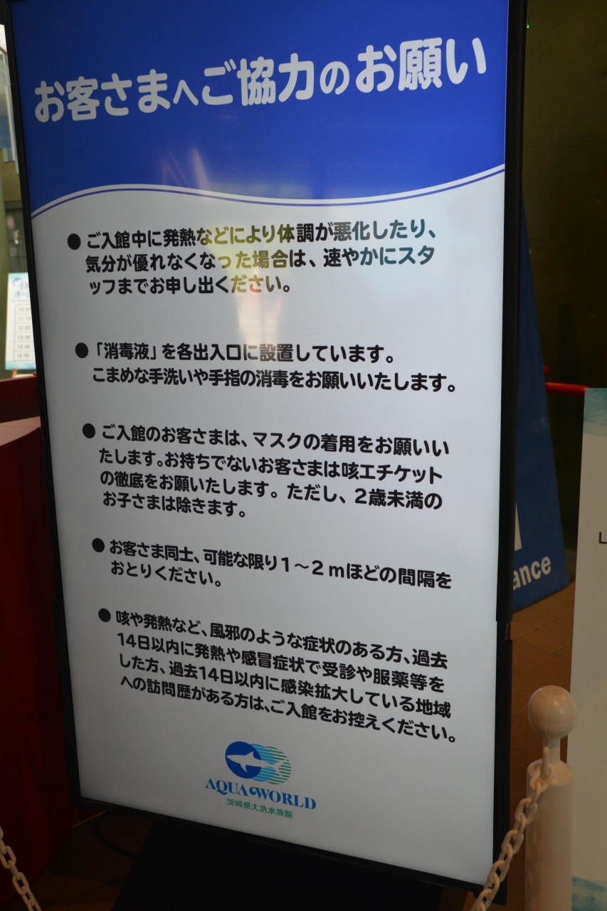事前に入館時刻でウェブ予約をしたQRコードを読み取ってもらって入場します。イルカとアシカのショーも、入場直後に予約券をもらっておかなければ見られません。手渡しではなく、人数を申告するとテーブルに置いてくれますのでそれを自分で取る仕組みです。ショーのスタンド席には1席おきに「着席しないよう呼びかける表示」が座面に貼られているのですが、小さいお子さんがいる家族の場合、ソーシャルディスタンスを家族内で取らせるのは無理ですね。お父さんかお母さんが表示の上に腰を下ろしている家族ばかりでした。難しいところです。
