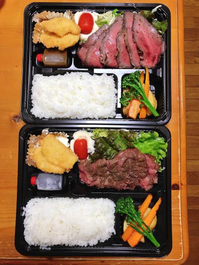 今日は応援する気持ちでステーキ弁当とローストビーフ弁当を電話注文。受け取りに訪れたのは夕食時でしたがお店にお客さんは無く、声援の言葉を掛けて持ち帰って来ました。しめて税込み3000円。キャッシュレス還元も5%。
