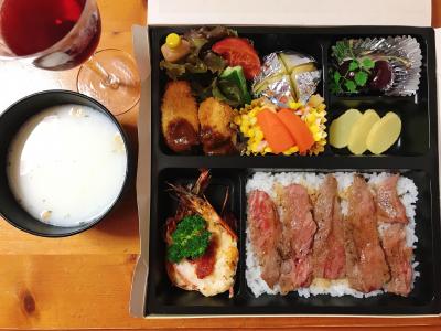 平日の夕方18時に取りに行くと、弁当は丁寧に包まれて置かれていましたが、店内では3組ほどが食事を楽しんでいましたので、出来たてというわけではなかったようです。冷めていてもA4ランクだという黒毛和牛の脂はしつこくなく、肉の味わいが口いっぱいに広がりました。それだけでなく、クリームコロッケも良い味付けでした。海老の焼き物も半身×2付けられているし、温野菜も複数種類、そして生野菜サラダもサウザンドレッシングがひと味利いていて、目も口も楽しませてくれました。季節のフルーツは大粒のアメリカンチェリーが2つでしたが、スーパーで買うものよりも味が濃い気がしました。香の物が何故付いているのかはわかりませんが。