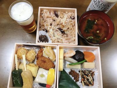 普段は2,160円する華弁当が2割引でした。三段重とはいえ一辺の長さが短いお重なので量が足りないかと思っていましたが、肉系は無いもののおからのコロッケ等の揚げ物が多めに入っており、デザート的な麩饅頭までいただくと充分満腹となりました。ビールにも合いました。- 旅行時期