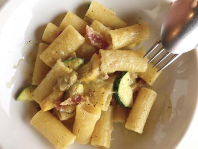 ピッツァは予想よりも大きめだったのですが、高齢の母も熱々を頬張っていました。マルゲリータのモッツァレラチーズは絶品で、カラマーリもトマトソースに少し効かせたチリが食欲をそそりました。リガトーニはかなり太めのショートパスタでした。パンチェッタとズッキーニのレモン風味というなかなか食す機会のない味でしたが、これはハマりました。個人的にはかーなり大好きな味です。