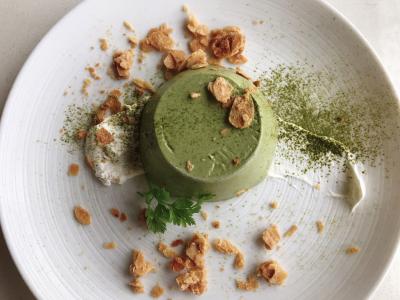 デザートも+300円で付けました。抹茶のパンナコッタでしたが、皿に楽しく盛り付けられていて満足できました。