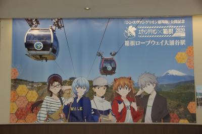 大涌谷駅も、1階に弐号機のパイロットである式波(惣流)アスカ・ラングレーの等身大フィギュアが展示されており、2階にも写真撮影用に描き下ろしデザインのタペストリーが設置されています。こちらはさほど混雑していませんでした。