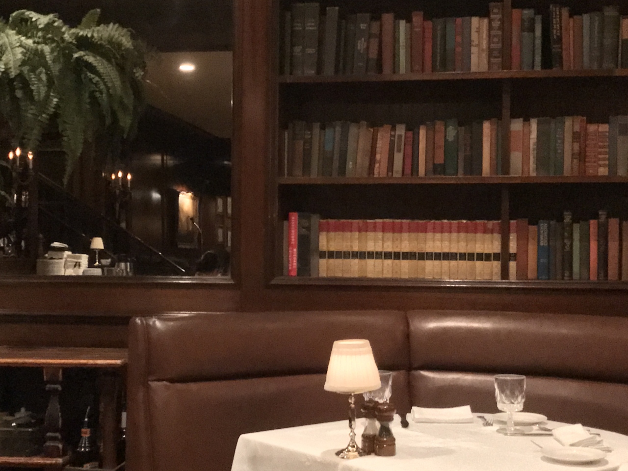クヒオ通りに看板は出ていますが、わかりにくいという方もいました。ワイキキパークハイツ内に進んでいくと突然右前に重厚感のある木のドアが出現します。一歩入るとそこはまるで英国の館のよう。アンティークな調度品(特に書棚と絵画が素敵!)でまとめられた落ち着いた雰囲気の店内で、今回の旅行の想い出となるディナーがいただけました。此処は、ドラマ『私立探偵マグナム』でマグナムが重大な頼み事をする場面で「Hy’sのステーキおごるからさ」とセリフに登場するほどゴージャスなステーキハウスなのです。