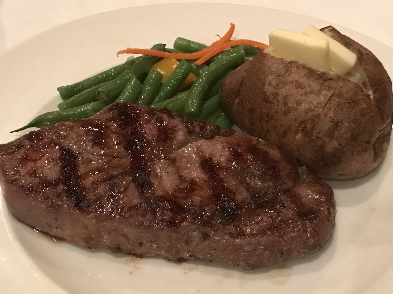 メインディッシュは、最初は名物のデルモニコ・ステーキと考えていたのですが、400g超とあるのを見て、ニューヨークストリップ・ステーキ(200g超)に温野菜とベイクドポテトが添えられたものに変更。家内はフィレミニヨン・ステーキ(200g弱)+温野菜とフレンチフライを注文しました。本日のお魚料理というものも選べましたが、ステーキハウスに無理やり連れて来られた肉が苦手な方のためでしょうか(笑) ニューヨークストリップは、熟成肉をハワイの香木キアヴェの炭を使ったグリルで絶妙に焼き上げられたプロの技が光る極上の味でした。「柔らかく風味豊かな味わい」との評判に違わぬ一品です。家内は「今まで食べたフィレステーキの中で最も美味しい」と感激していました。タキシードに身をつつんだテーブルスタッフに話したら喜んでくれました。