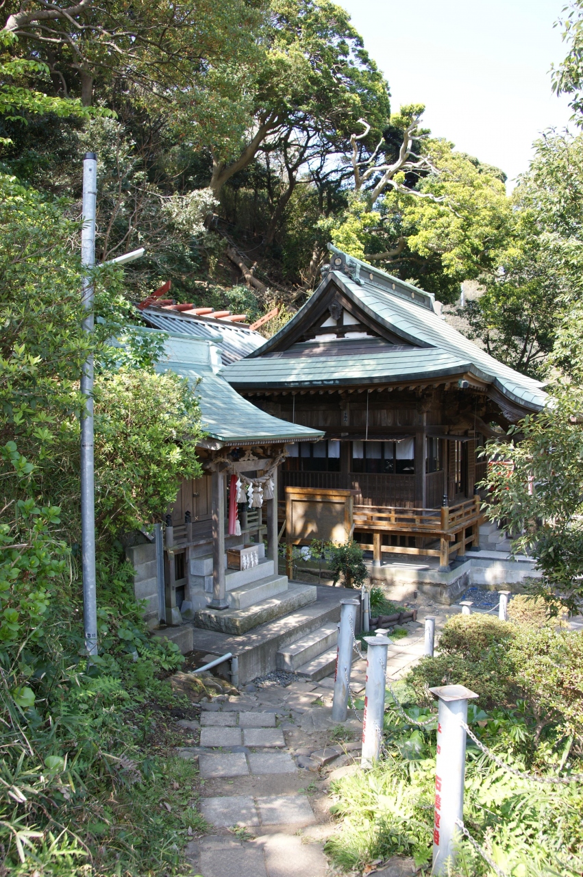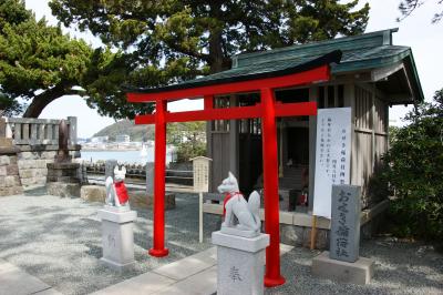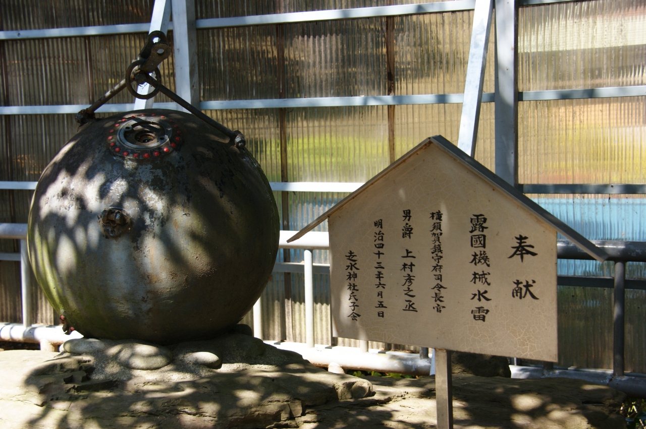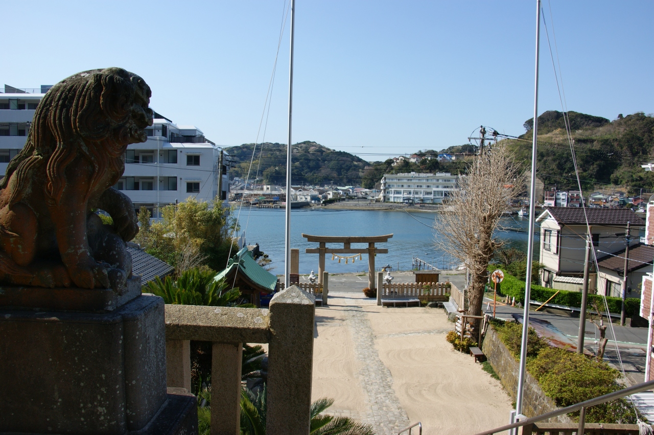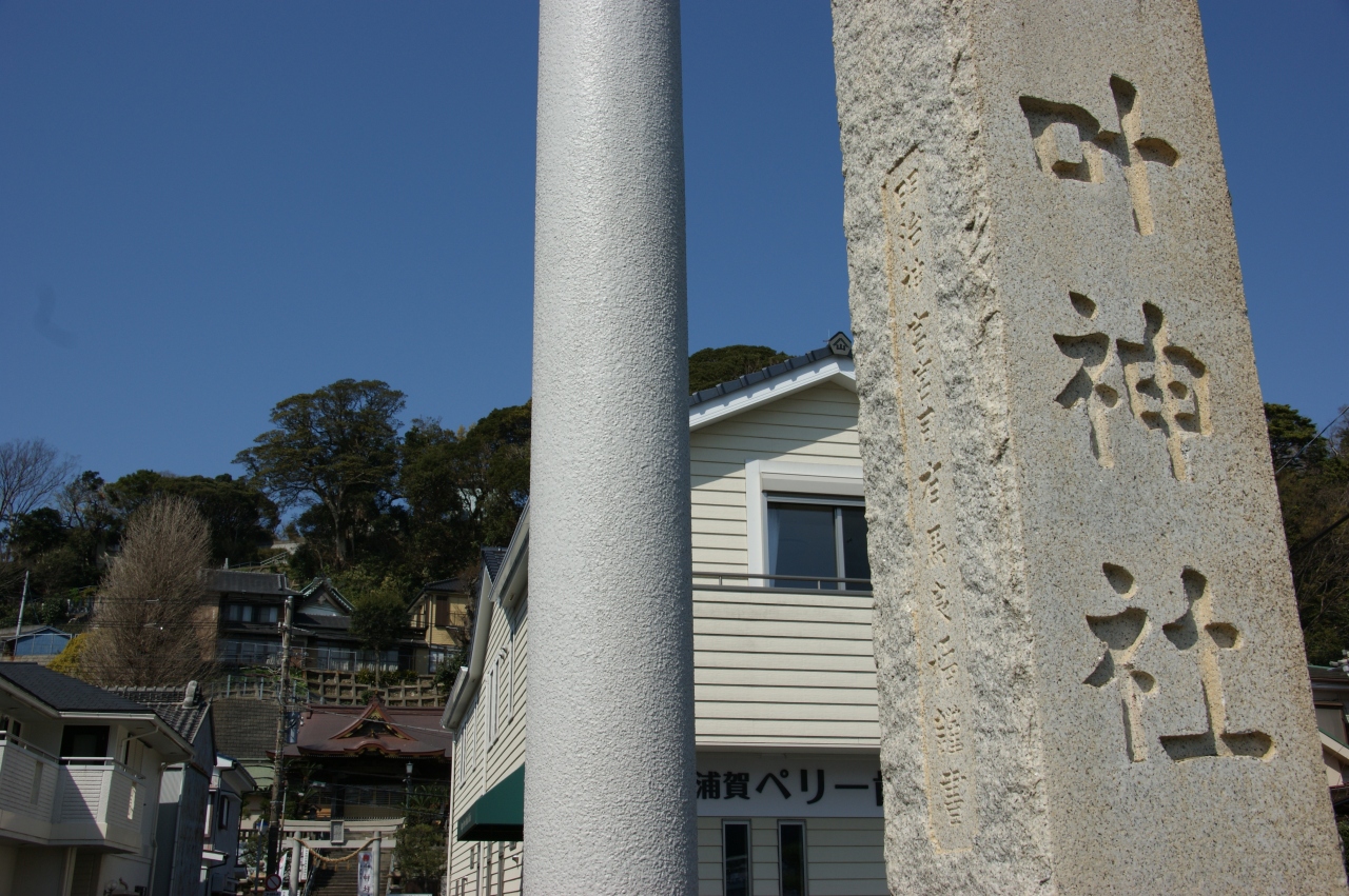 本殿は駐車場脇から入った参道に続く石段の上にあり、さらに少し上った高台からは、東京湾の素晴らしい眺めが得られます。第二海堡の向こうに見えるのは房総半島です。高台と反対側に展示されているロシアの水雷もお見逃しなく。