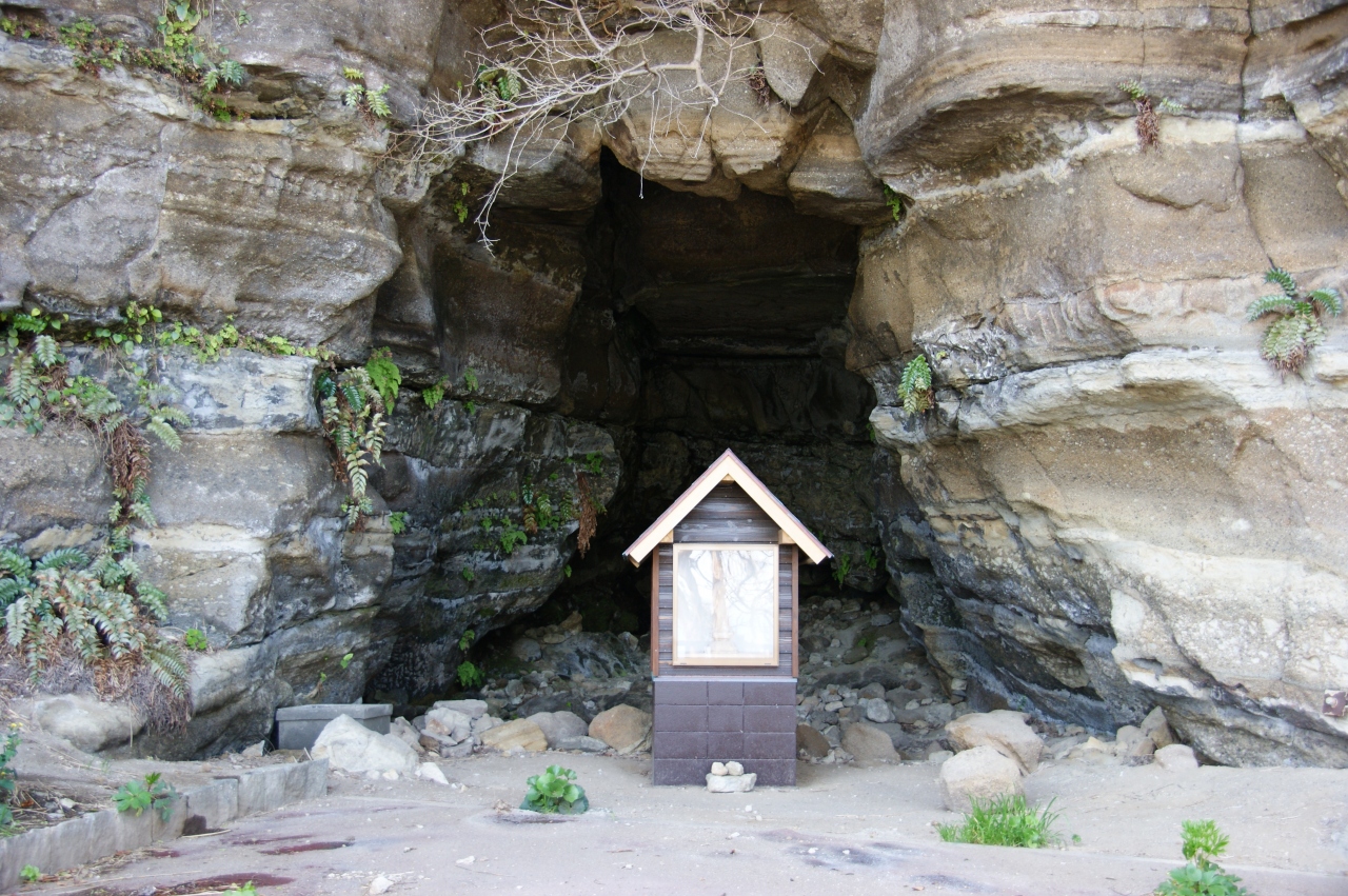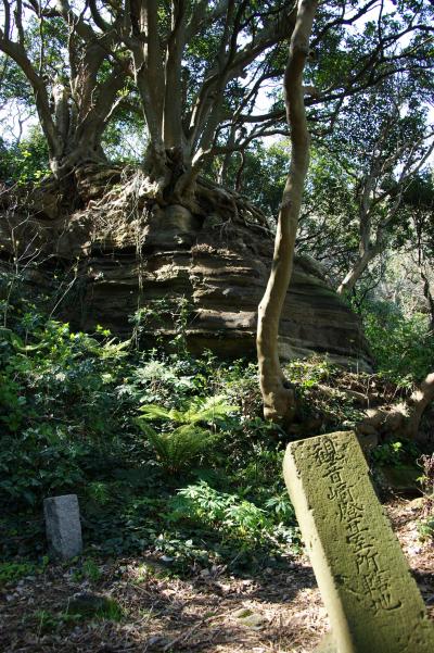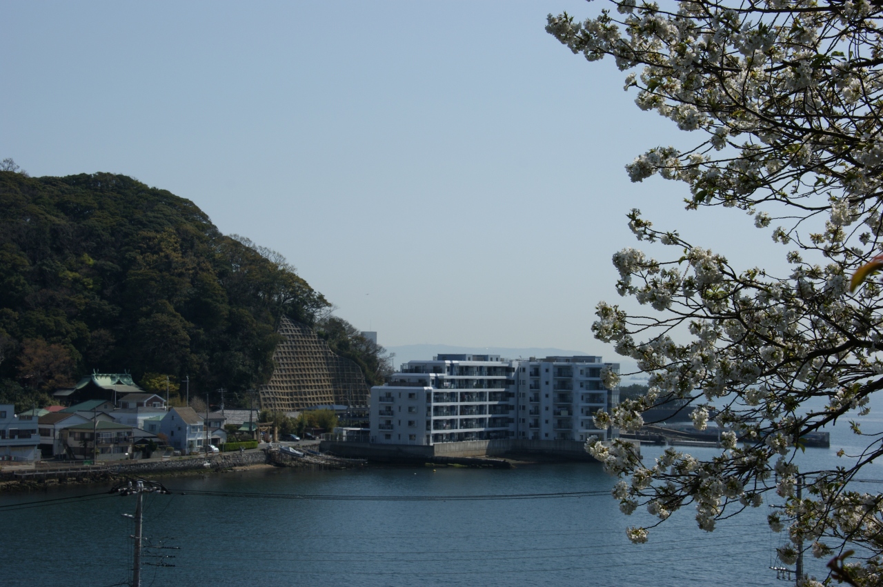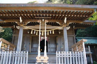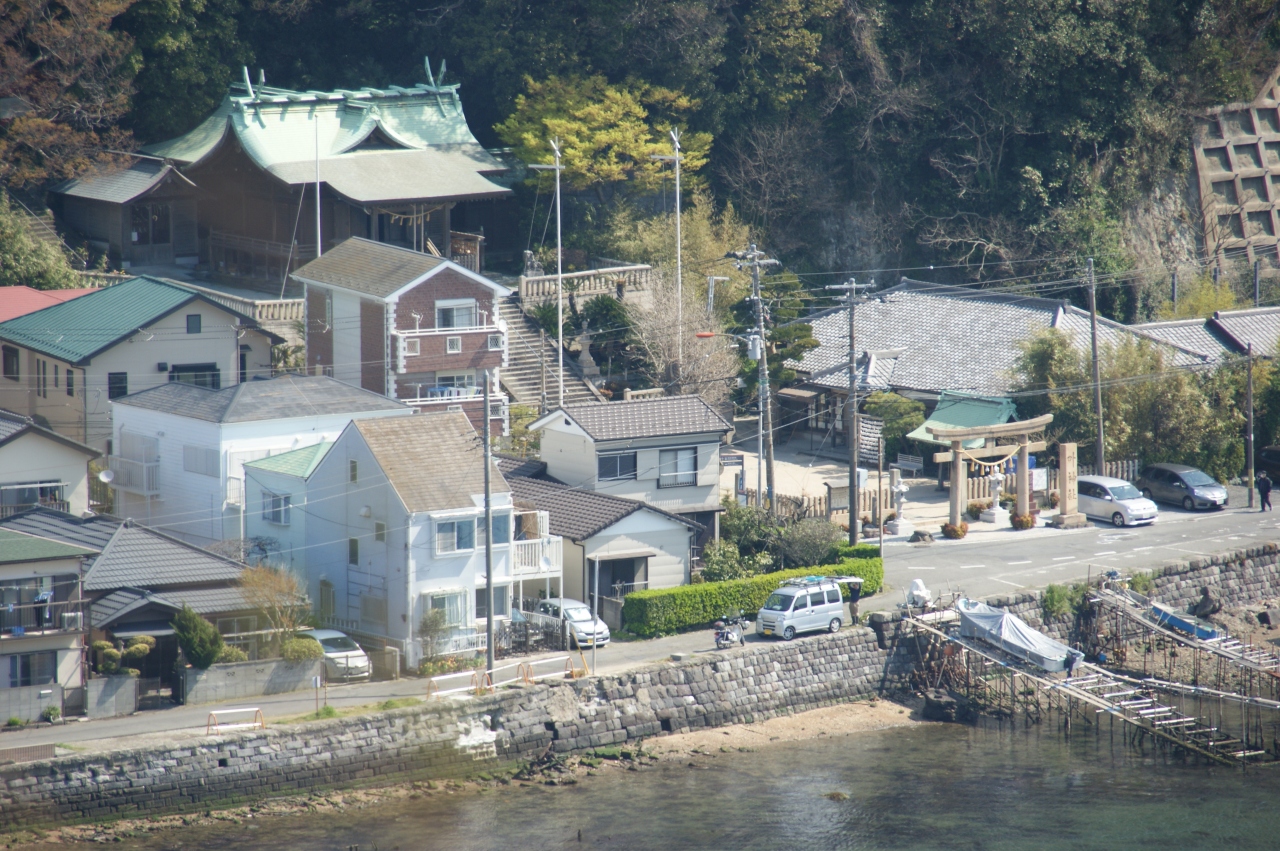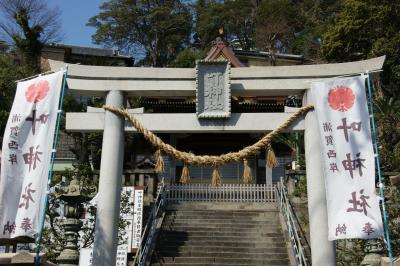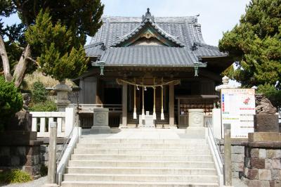 本殿は駐車場脇から入った参道に続く石段の上にあり、さらに少し上った高台からは、東京湾の素晴らしい眺めが得られます。第二海堡の向こうに見えるのは房総半島です。高台と反対側に展示されているロシアの水雷もお見逃しなく。