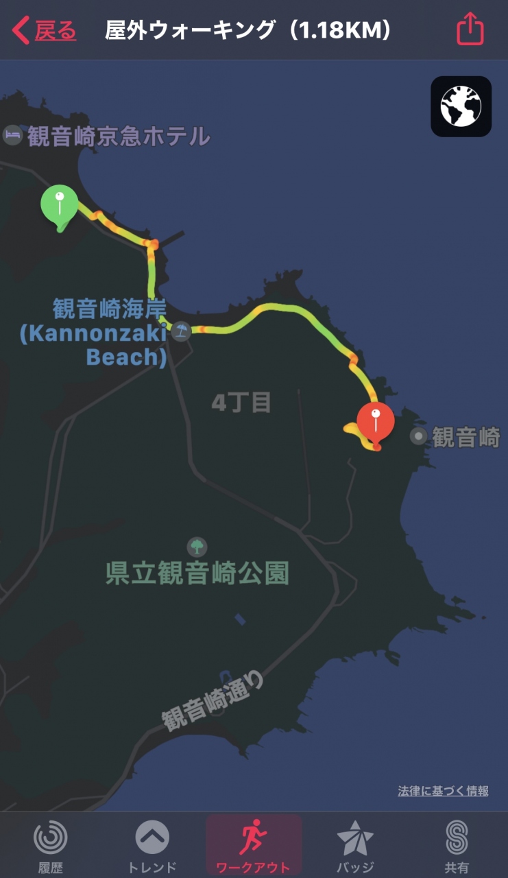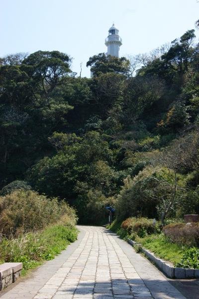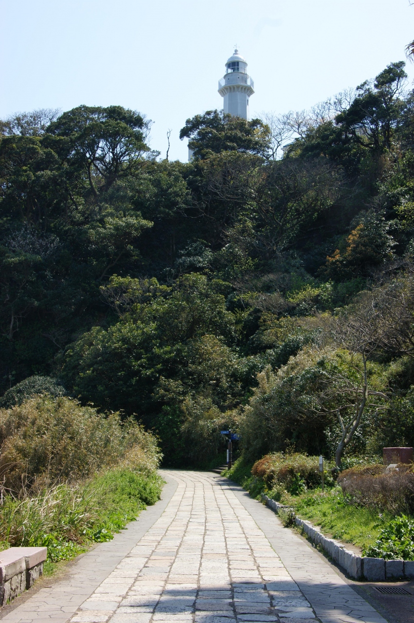 横須賀美術館内アクアマーレのオープンテラス席でランチを楽しんだ後、海側のボードウォークから散策を開始。侵食された不思議な岩の風景を左に見ながら、そのまま公園内へ。ファミリーがテントを張っているエリアを過ぎ、行基が大蛇を退治して十一面観音(船守観音)を祀ったとして観音崎の由来と伝えられる海蝕洞の先をしばらく行くと灯台への道は右へ。それなりの登りとはなりますが、シダの鮮やかな緑などに癒やされながらゆっくり上がって行きましょう。美術館から灯台まで1.18kmの軽く汗をかくハイキングコースでした。
