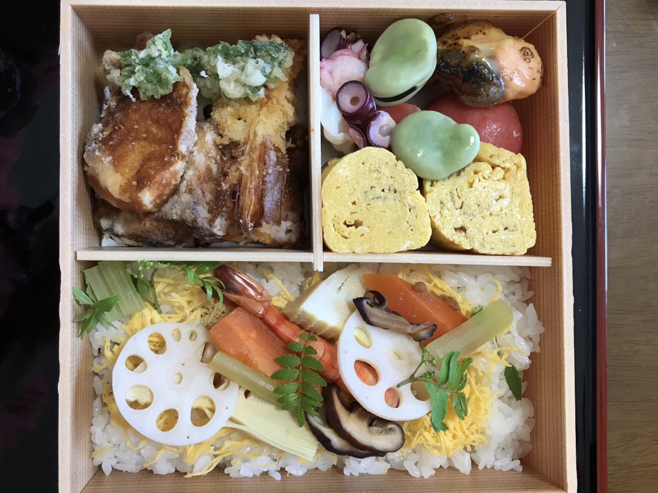緑風弁当(税込1,800円)を電話で3個注文しておきましたが、店の方が底に手を当てて丁寧に渡してくれる気の配りよう。さらに「このような時期ですのに有り難うございます」と最敬礼され、疫病退散などを願う言葉「蘇民将来之子孫也」と書した札をそれぞれに添えて下さいました。