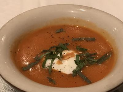まず私は本日のスープ(トマトのポタージュ)、家内はミックスガーデンサラダをチョイス。ポタージュはトマトの酸味も絶妙で、なかなかの美味でした。