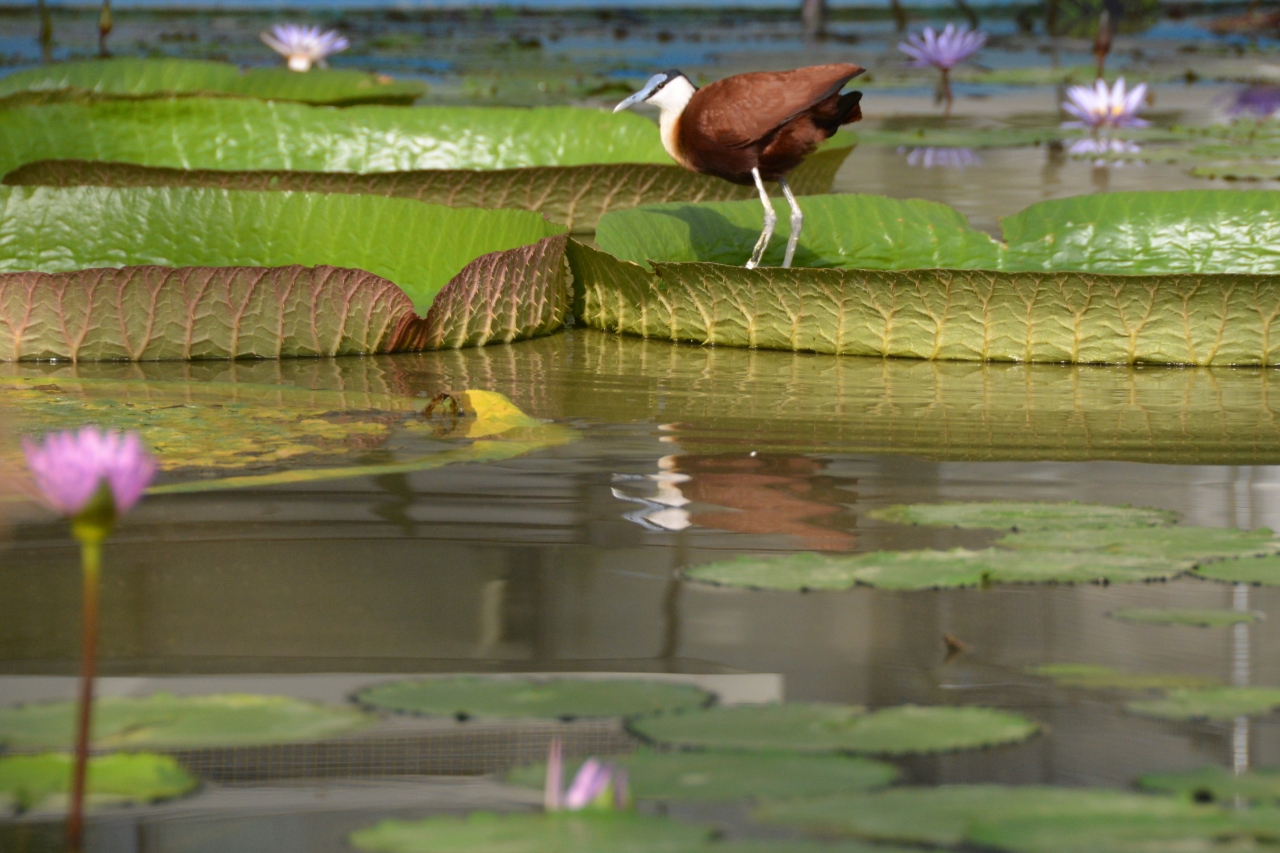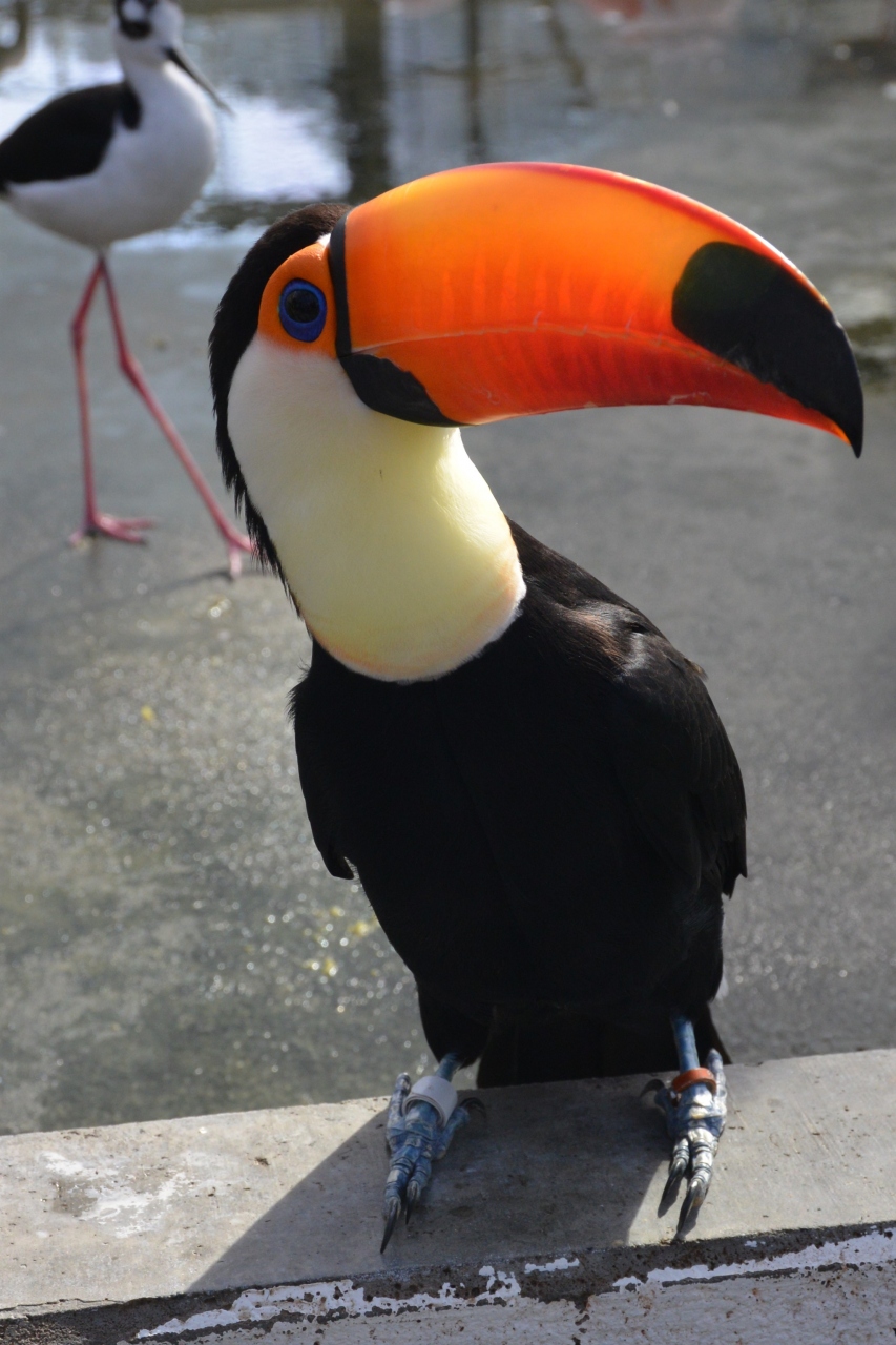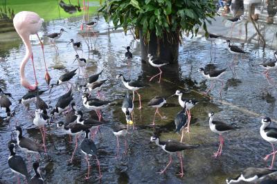 とにかく檻の向こうではなく同じ空間に大小さまざまな鳥たちが居るので、鳥好きにはたまりません(鳥が苦手な方は来ないでしょうが、そうだと一歩も進めないかも)。ワライカワセミも元気に笑って(?)いたのですが、カメラを向けた途端にお澄まししてしまいました、残念! スイレンプールの前に見られる南米の大型魚ピラルクもかなり巨大な個体でしたし、小さめながらのオオオニバス、その上で遊ぶ鳥も絵になりました。一番奥では目玉の一つハシビロコウが動かずにwお出迎えしてくれます。餌を食べる時は動くのですが、かなり不器用なのですぐ落としてしまい、それがまた笑いを誘います。水辺を設けた別の温室へ進むと、色鮮やかなオオハシやサギなどがお出迎え。おびただしい数の大小の鳥たちが遊んでいました。