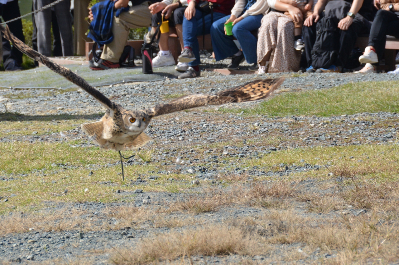 この屋外ショー、実に巧く構成されており、2人の飼育員の方たちのトークも慣れたもので感心しました。フクロウが翼を広げて羽ばたく様子や、ヘビクイワシが執拗に無慈悲な攻撃(笑)を蛇(ゴム製ですが)に対して行なう様子は、他ではなかなか観られません。またハリスホークが観客たちの頭スレスレに低空飛行する様子も迫力満点でしたが、日本名でノスリ(野擦り)と呼ぶ理由に初めて合点がいきました。屋外バードショーで満足・興奮し、ペリカンの池を見に行くのを忘れるほどでした。