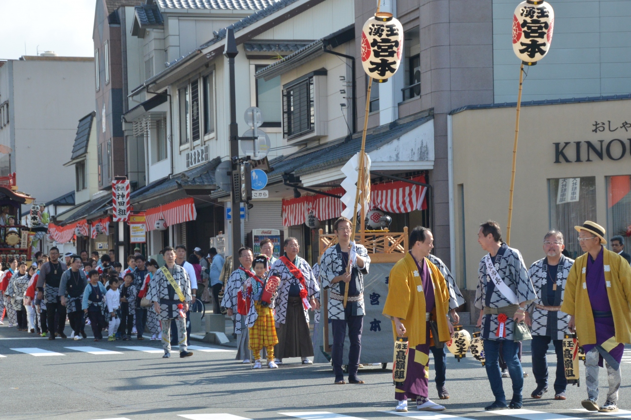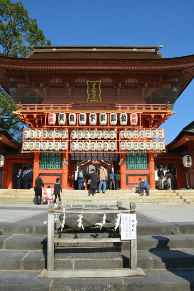 楼門の前には眼鏡池の別名を持つ鏡池があり、そこに架かる輪橋を渡って参道を進みますが、例祭の日には左右にびっしりと露店が軒を連ね、その狭~い表参道を例祭を祝うための威勢の良い「富士宮囃子」を奏でながら山車などが曳き回されて進む様子は迫力満点です。楼門には「富士山本宮」と記された額が掲げられています。
