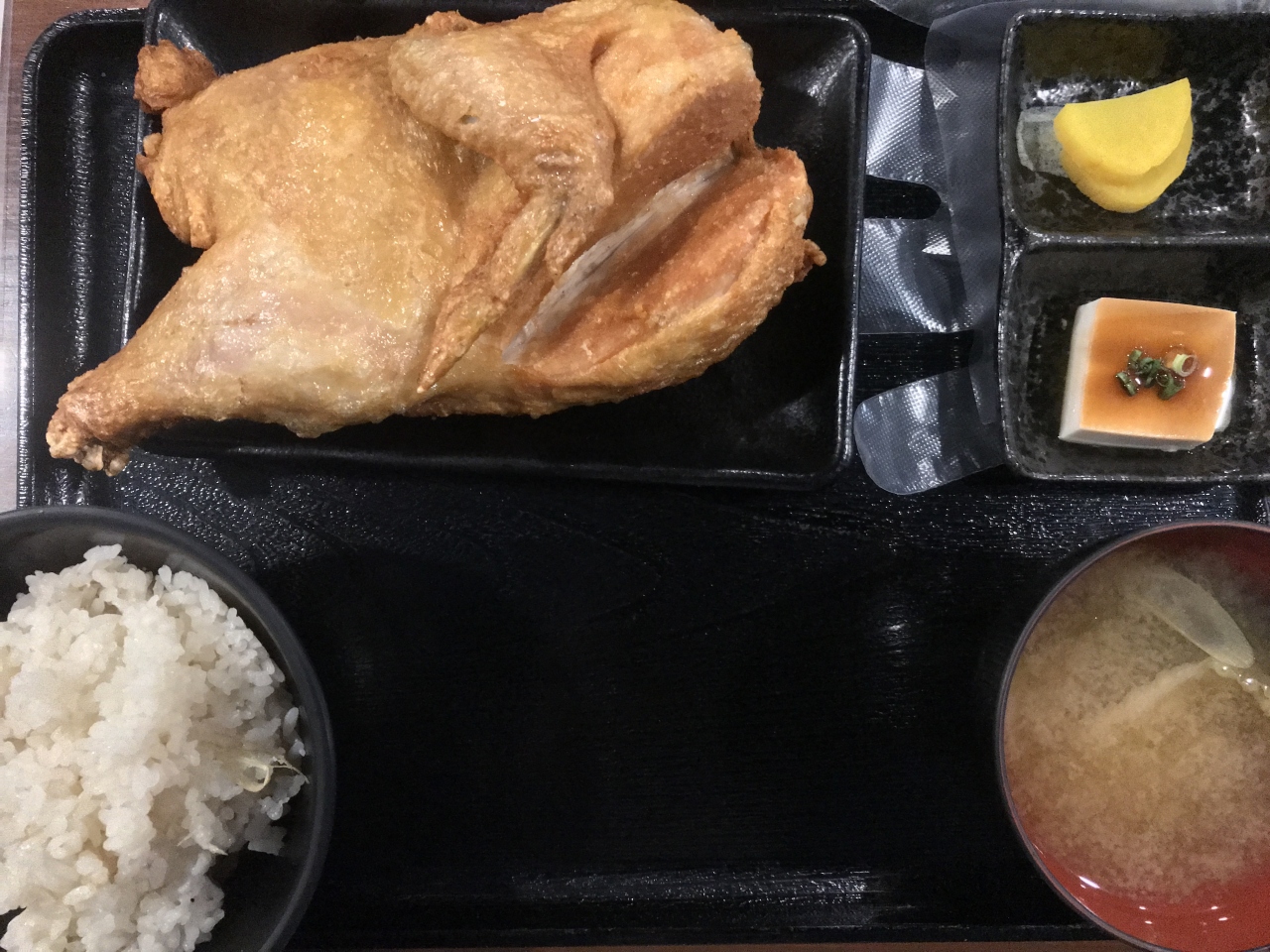 若鶏半身揚げ定食は1,200円とやや値が張りますが、デパ地下でいつも買っているのよりも一回り以上大きい若鶏半身揚げにお味噌汁・小鉢・お新香が付いています。ご飯は生姜ご飯も選べました。ポリ手袋を左手に装着し、右手の箸も併用してかぶりつきました。文句なく旨い一品でした。余ったら持ち帰りが出来るようでしたが、全てペロリといただきました。